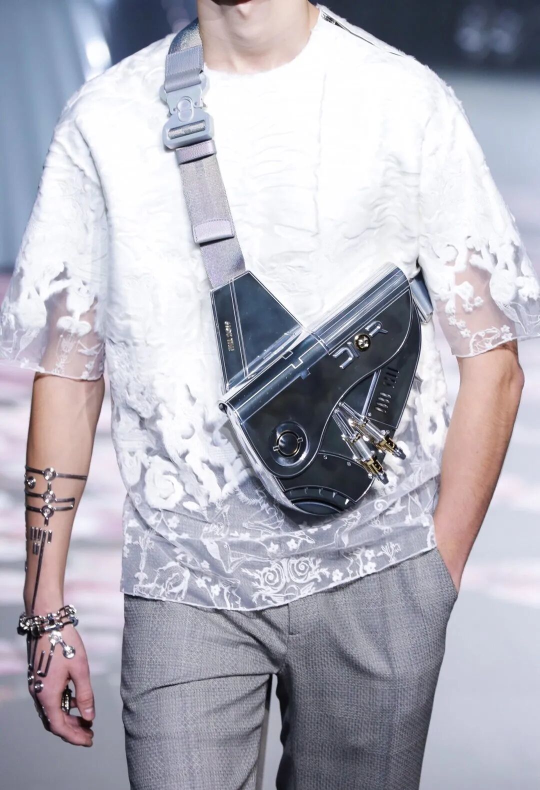 不难发现,这些作品均有着强烈的科幻复古美学,背景一定是满屏的霓虹灯,飞速运转的电子屏幕,人物穿着未来感的亮面皮衣,金属光泽的科技面料,纯黑色的窄版墨镜......然而笼罩在人们脸上的,或是冷漠,或是疲惫,在高科技的另一边,是昏暗压抑的阴雨连绵,经典的香港九龙寨贫民楼也常常作为其中一个重要元素出现。在如此矛盾的反差里,这些作品背后透露着的是无能为力的末世画面。众多影视作品的影响下,「Cyberpunk」也走上了延展台,步入了嗅觉灵敏的时尚界。想必大家不会忘记,在2021年早秋的Dior Men东京秀场上,Kim Jones联手空山基在现场打造了一个高11米的Sexy Robot雕像,这个有着完美曲线的女机器人,在现场镭射灯光的变幻下尽显光芒,极具科幻效果,也完全点燃了整场秀的「Cyberpunk」灵魂。而Kim Jones也呼应了整场秀的主题,为那一年的Dior带来了银色金属面的马鞍包,以及各种机械风的亮面指套等等机能单品。刷新了「Cyberpunk」在穿戴设备上的具象化演绎,掀起了机能风,金属感的潮流趋势。那么,回归到开头提到的《Cyberpunk 2077》,它的出现更像是一个对「Cyberpunk」文化的集大成者,无论是从游戏画面,背景故事,到玩法设置的意义,都是对以上所有「Cyberpunk」题材的总结并且升华的一款制作。《Cyberpunk 2077》的背景故事设定在2077年,那时的世界已然步入科技高度发达的阶段,大财团取代了政府,一切围绕着资本在运行。夜之城作为这个未来世界的主要城市,被明显地分割成了两块区域。黑暗,腐败,暴力横行的穷人区,以及干净,有序,其乐融融的富人区。从释出的预告片中可以看出,两个区域有着非常强烈的贫富对比,而被资本科技支配的生活则使得穷人越穷,富人越富。除了背景故事,预先曝光的游戏画面质感,也非常「Cyberpunk」。2077年的人大多采用了金属身体。在围墙内外,精良的画面和人物塑造将贫富两个区域的对比诠释得淋漓尽致,逼真的浓烟,火光,以及富人生活的整洁街道,人与人之间无止尽的斗争火拼,贴切又魔幻。除了以上这些,《Cyberpunk 2077》在玩法设定上力求用户体验,带给玩家的是沉浸式的游戏玩法。你在游戏中的外表,性格,穿着甚至性别都由自己决定,并且在执行任务的过程中,可以按照第一人称的意愿修改剧情,仿佛真实人生重现。让玩家们通过键盘,鼠标,屏幕行走在夜之城里,却感受到实地与NPC对话,火拼,交流,战斗的体验,开拓了玩家对2077年的各种想象,身临其境地过一把反乌托邦的人生氛围。《Cyberpunk 2077》无论从硬件还是软件的配置上,都是当下对「Cyberpunk」一种全新的解读,所以从其宣布开发之日起,就牵动着万千Z世代的心。也正因如此,虽然游戏还没正式推出,但市场上不乏围绕《Cyberpunk 2077》而推出的联名产品。在这其中,有一款诚意之作最令小编期待,那就是昨天发布的一加手机联手CD Projekt Red出品的限定版一加8T。为啥说它有诚意呢?首先刚拿到手时我们就觉得它颜值很过关。手机整体形状还蛮棱角分明的,跟市面上大部分手机不太一样,背面是那种上中下的分段式设计,拿在手上有时尚圈流行的拼接风内味儿,机能感十足。顶部开了个“天窗”,呼应夜之城中的高科技环境。中部则首次使用一项全新的AG工艺,呈现出独特的雪霜纹理,质感摸起来也很舒服。底部logo用了《Cyberpunk 2077》醒目的黄色来点缀,整机的黑黄配色与游戏画面相一致,观感舒适。除了外观高度贴合游戏,这款限定版一加8T在OS层面也做到了深度定制。从开机画面开始,留给玩家的就是纯粹的“沉浸式体验”。app图标,指纹解锁这些深度细节都有照顾到,看得出有在力求贴近《Cyberpunk 2077》的游戏操作界面,视觉上也运用了很多镂空,透明的元素,使用过程中恍惚以为自己在玩游戏的感觉。还有一个“小心机”,就是手机的通知光效运用了赛博朋克里最为常见的视觉元素——霓虹灯,而且逼真地模拟了霓虹灯刚通电时的闪烁效果。这让小编我有一种收到神秘暗号的幻觉,接收通知这件小事也变得有趣起来。不过,小编最喜欢的还是这台手机特有的赛博朋克滤镜。一加高度复刻了游戏画面的风格,有加州北部和夜之城两个效果可以选择,随手咔一张普通街景都有了股赛博味儿,上手试了一下,果然出片率甩好多相机app几条街。如今,在Z世代主导的浪潮下,跨界联名产品越来越多。但真正的跨界潮品,并不是敷衍的logo叠加,单纯的配色相加。而应该是由内而外的细节体现,将两个品牌最深层的文化激发出来的设计。说到这,小编不禁想起「Cyberpunk」的核心思想:High Tech,Low life。在高速发展的技术背景下,个体价值如何自洽,是选择随波逐流还是坚持初心,全凭你自己。不难看出,CD Projekt Red和一加手机明显都是后者,此番一加8T赛博朋克2077限定版不仅将潮酷二字在外表上体现得淋漓尽致,功能上的深度定制也硬核得让人无可挑剔。这样的诚意出品,需要双方品牌有着同样的打磨恒心,更需要其对「Cyberpunk」这一主题有着相同的见解和思考,求同存异。一加和《Cyberpunk 2077》确实做到了。