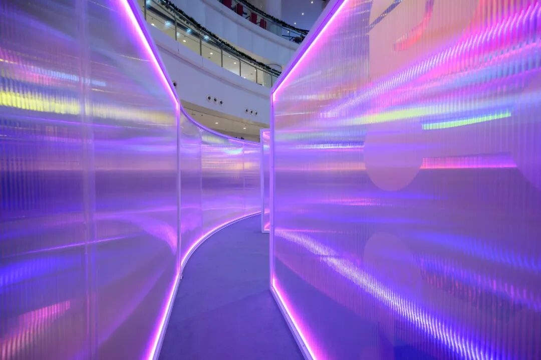 我觉得这个展位做的蛮屌的,我本来没有想法说会有这么大一个展在这个中庭的位置,然后前几天Eddi他们跟我发了正在装修的一个布置的效果,就我觉得,哇,这么大一个的一个地方。而且这个迷宫做出来我们刚进来的时候根本都找不到路。说实话这个场景做的有点赛博朋克那个感觉。