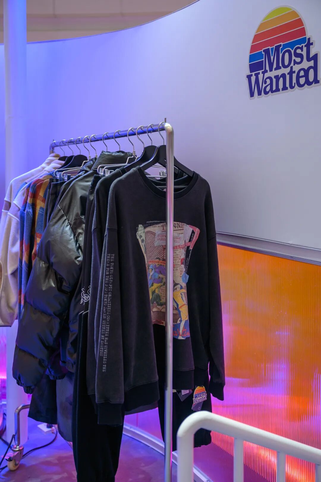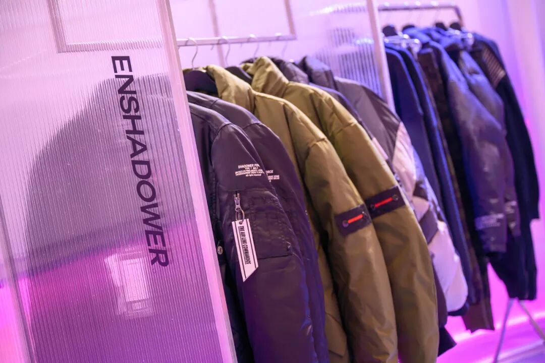 这次展览中有一部分是最新的单品,有一些是我们今年卖得还蛮不错的单品。因为现在是冬季嘛,放的有些是羽绒服、厚的棉服之类的,中间有个口袋,一个口袋那个样式的有点带迷彩纹路的那个,这还蛮好的。所以我们这次也是在这个活动里面带过来。