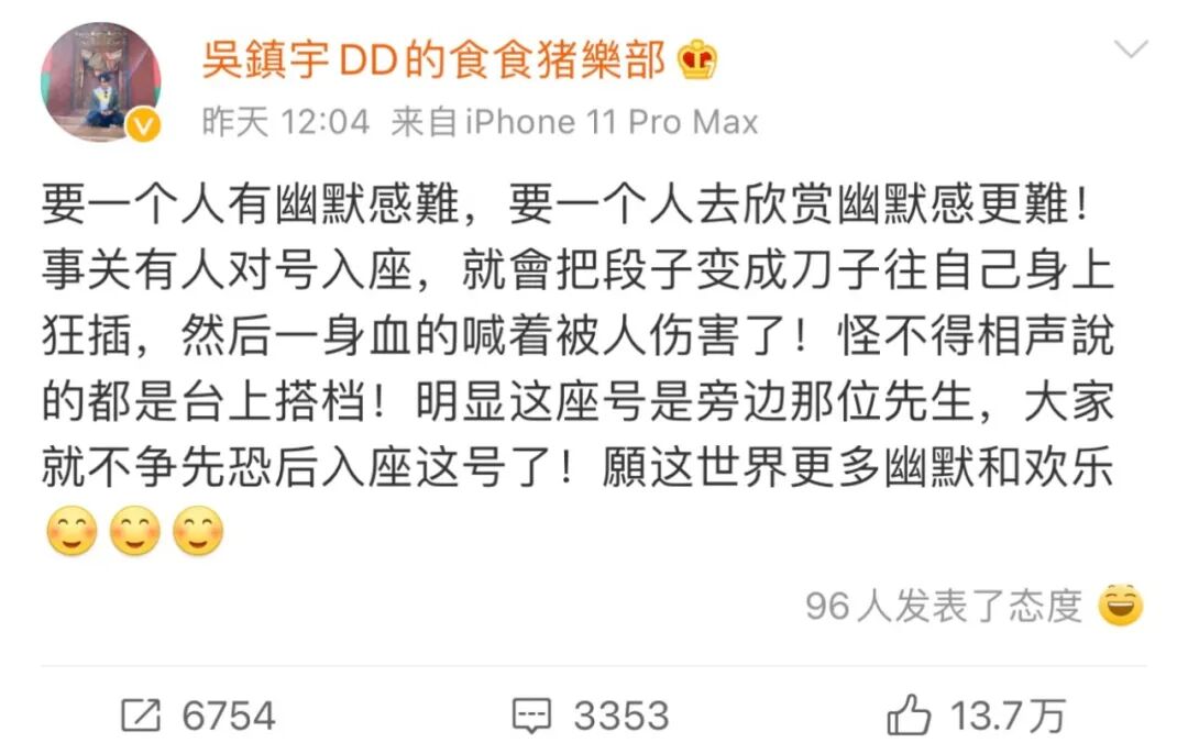 “事关有人对号入座,就会把段子变成刀子往自己身上狂插,然后一身血的喊着被人伤害了!”