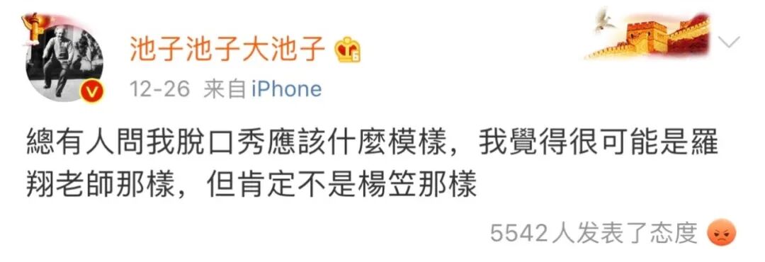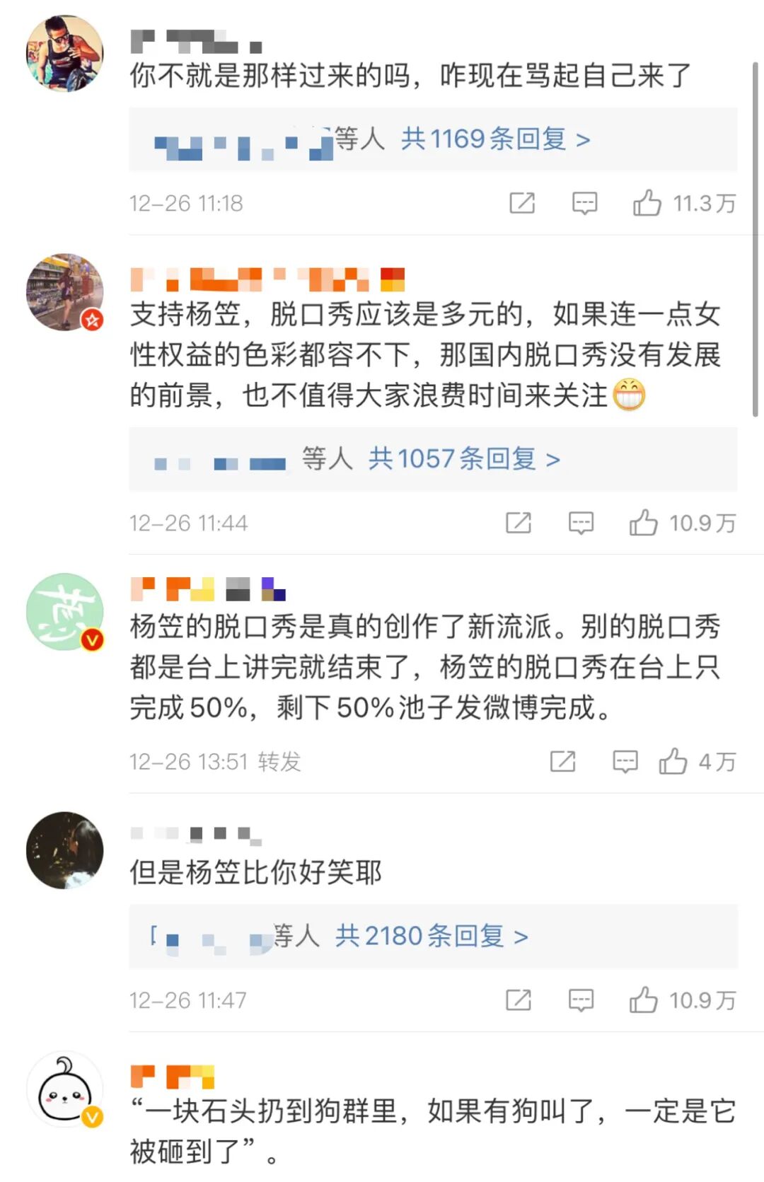 还有人更狠,找出了池子当年拿女性开黄腔的段子,直接贴在他的微博下,得到了30000多条点赞。曾经上过《奇葩说》的武汉大学哲学系副教授周玄毅一语中的地如此评价:“一个资深脱口秀达人,居然以‘这不是脱口秀应有的样子’来回应一个他所不喜欢的脱口秀,这说明什么?这说明,那种会被脱口秀刺痛的世界观,本身是很难产生脱口秀的。”