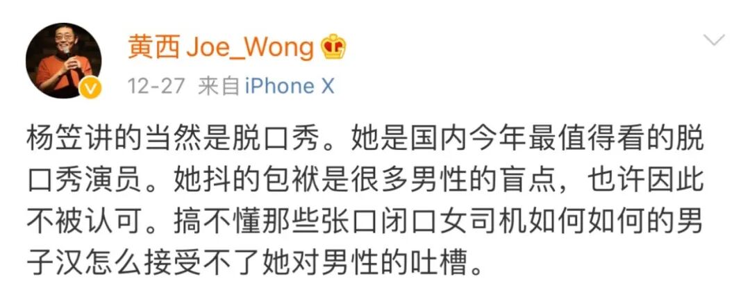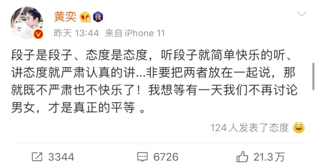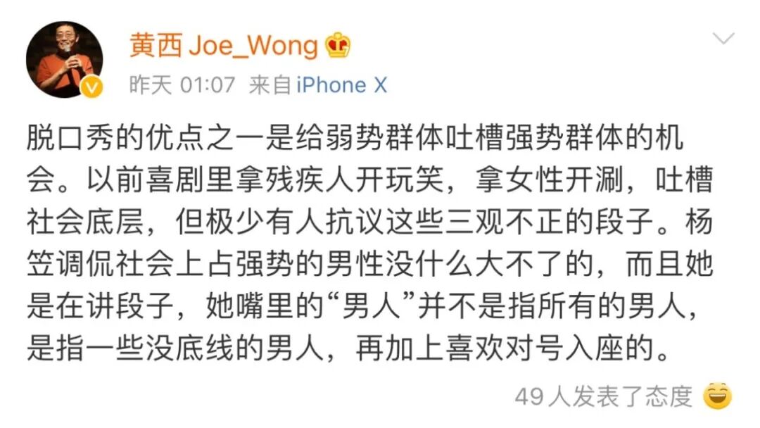 微博上甚至出现了一个有趣的热搜话题,叫做#支持杨笠的男性态度#。有些人觉得杨笠说得挺有意思,有些觉得不好笑,但没关系,由她说,没什么大不了的;还有些人觉得杨笠说得相当棒。比如,脱口秀演员、主持人黄西就认为杨笠是“国内今年最值得看的脱口秀演员”,还表示“脱口秀的优点之一是给弱势群体吐槽强势群体的机会。”