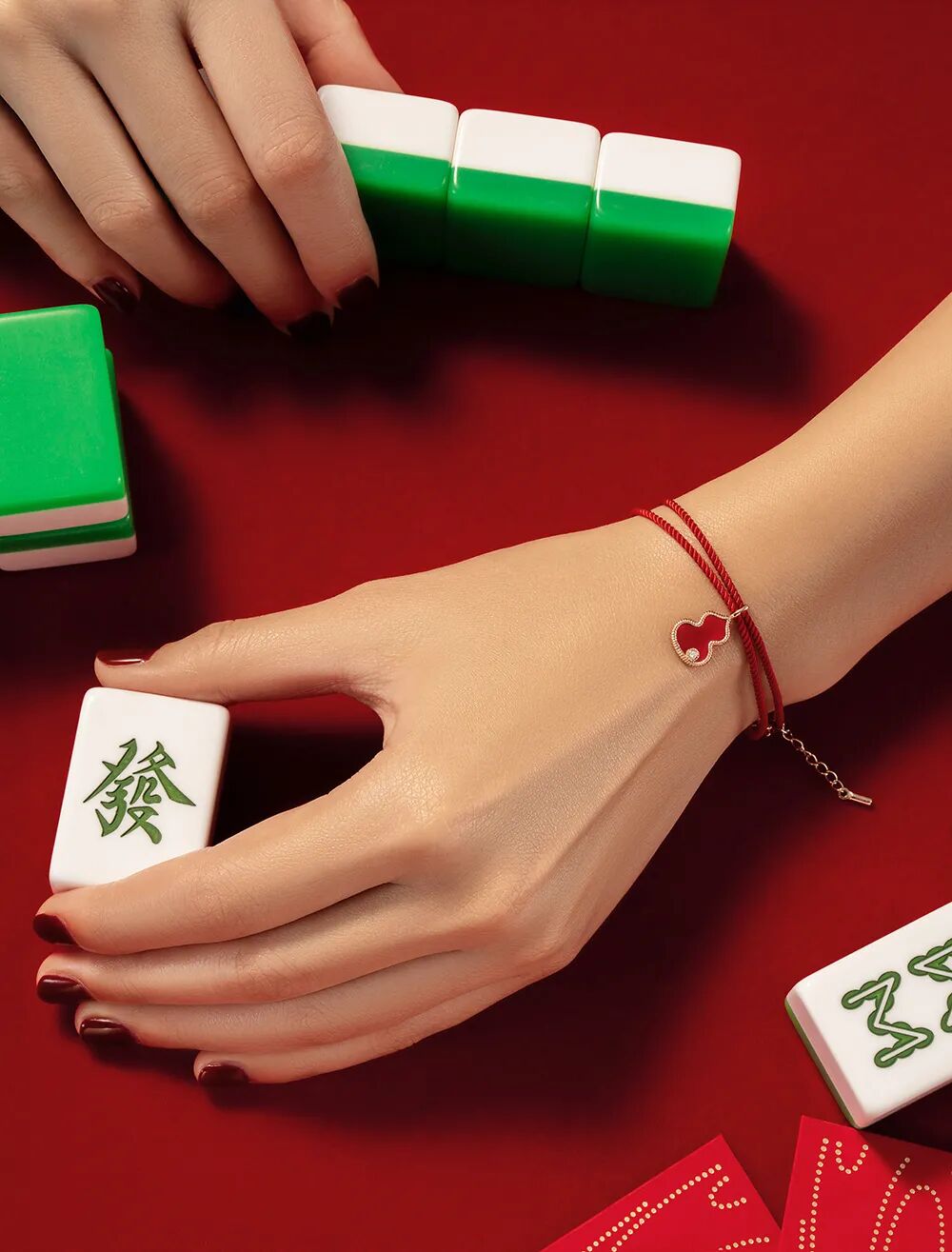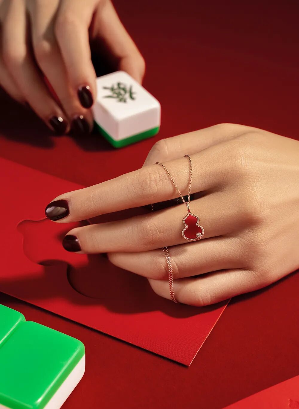 在珠宝的戴法上,Qeelin与包先生于设计伊始便达成共识,希望以创新的方式呈现本次珠宝作品,加入一款可调节长度的红绳巧思相应而生。红绳在传统文化中与葫芦一样象征福运,此次将两种传统元素以现代摩登设计联结,除了18K玫瑰金项链的搭配,红绳亦可缠绕腕间,双重佩戴方式为时尚造型增添趣味与个性,演绎无限可能,展现了Qeelin与包先生的时尚灵感碰撞。