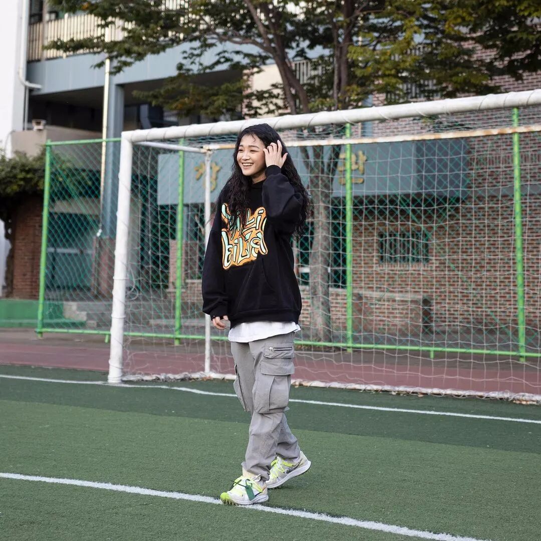 她的日常穿搭更像是在我们身边看到的球鞋女生,通常都会是卫衣、长裤搭球鞋,非常平易近人。