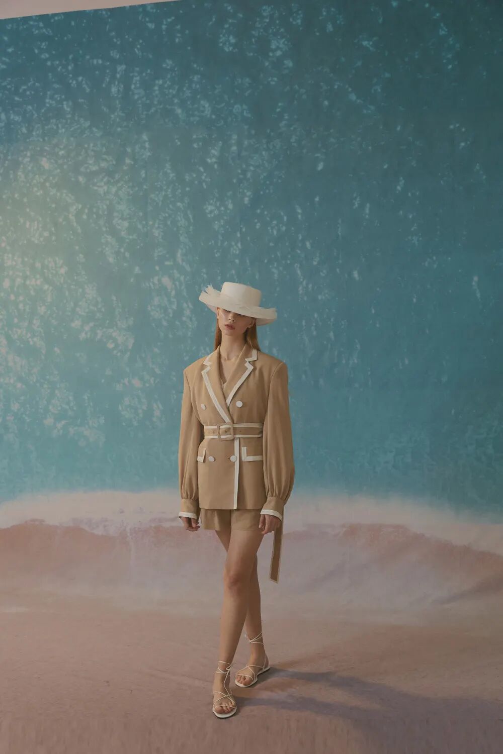 而且我更喜欢她一些不怎么规矩的西装,比如这件韩国本土品牌Romanchic的,少见的卡其色,加上白色的滚边设计,很复古。