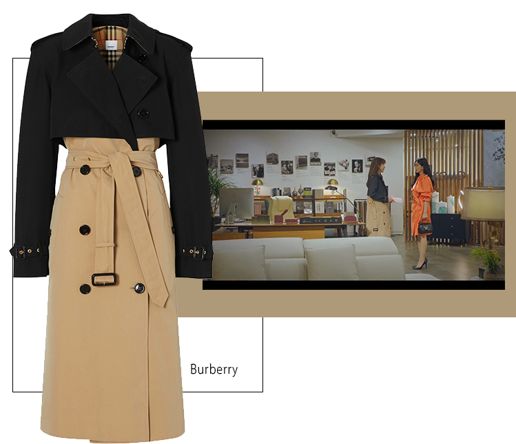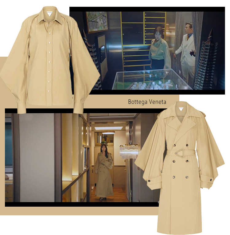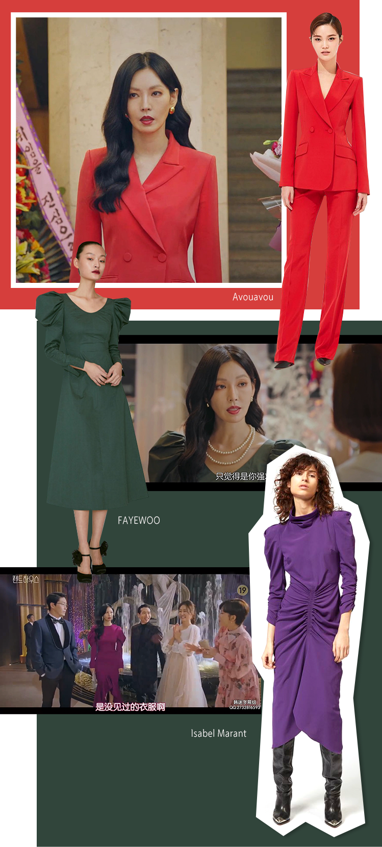 后期她拿回母亲的家族企业经营权,回归职场,穿搭也多了各式干练的衬衫、西装、风衣。