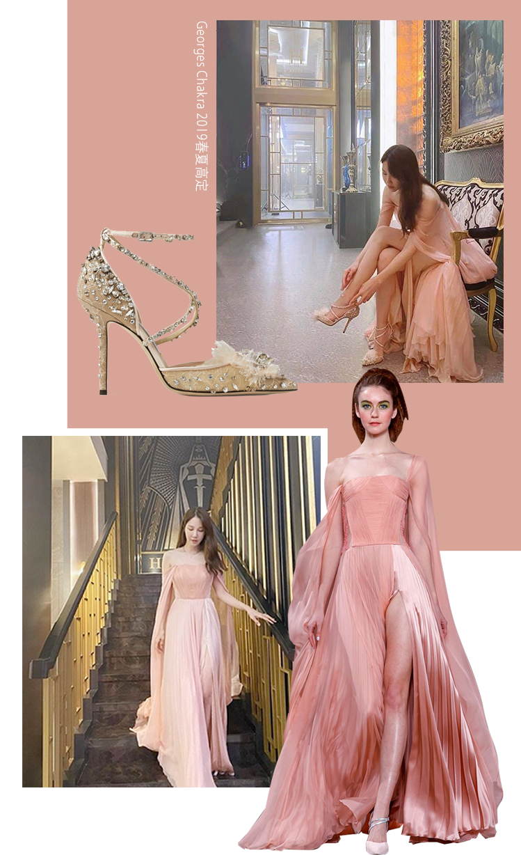 这件珊瑚粉配色的高定长裙,来自黎巴嫩品牌Georges Chakra,搭配Jimmy Choo高跟鞋,这是她的Party造型。
