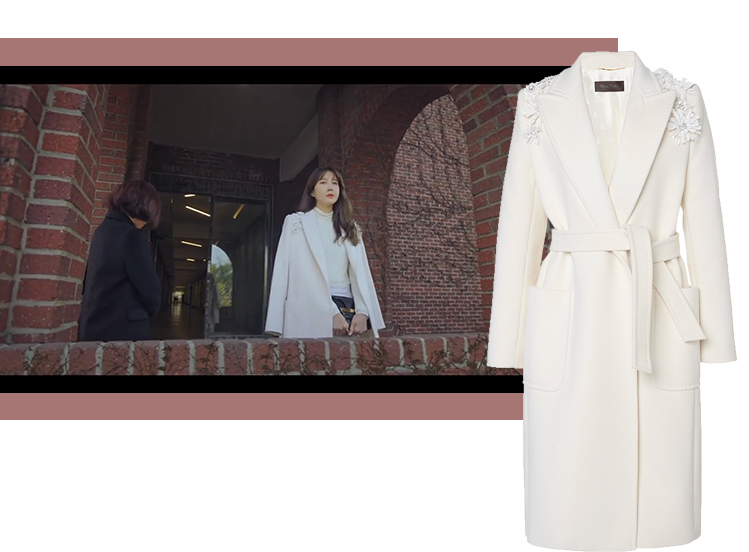 这件纯白的Max Mara大衣,肩部添上了精致的白花,视觉上延伸了肩部的比例,温柔中又自带一种大女人的气场。