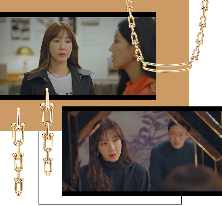 我最喜欢的是她常戴的TIFFANY & CO HardWear系列,18K的黄金链条耳环,约5万块,链条项链,约9万元。