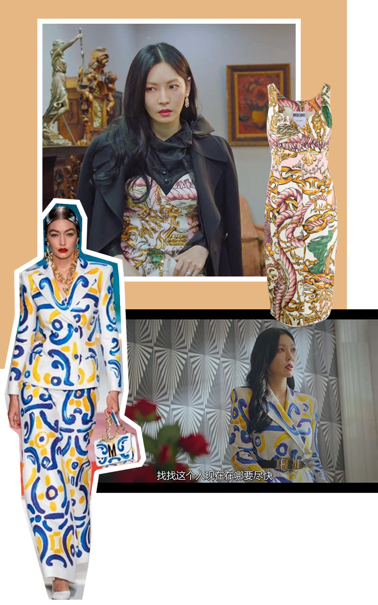 怪诞的Moschino彩色西装、礼裙,也很对她的胃口,时髦不时髦另说,但她一站在那儿就有种威风的女总裁内味儿。