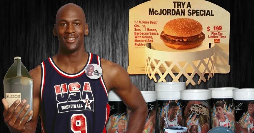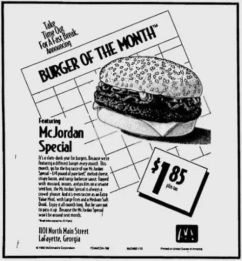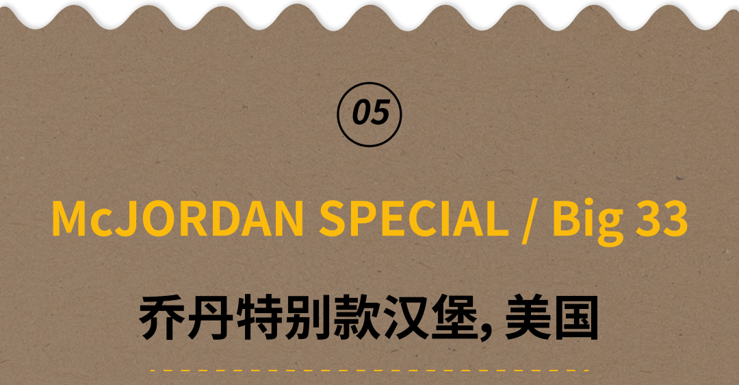 这款诞生于上世纪90年代的乔丹纪念款汉堡由牛肉饼、培根以及一款特制McJORDAN BBQ酱料组合而成。它的原型是代表着传奇球星大鸟伯德(Larry Brid)的 Big 33,而当乔丹的人气超过了伯德之后,麦当劳就“喜新厌旧”地把 Big 33 进行了升级,于是就有了豪华版的 McJORDAN SPECIAL。