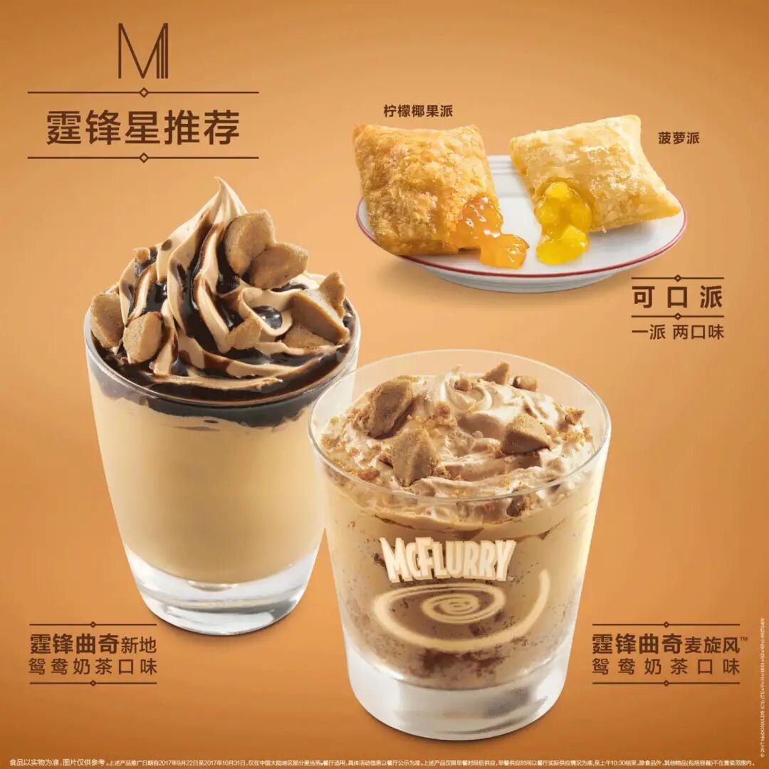 所幸还有“霆锋星推荐”的甜品系列来扳回一城,分别有鸳鸯奶茶口味的新地和麦旋风,撒上谢霆锋标志性的自创曲奇,味道贯彻了麦当劳一贯的甜品水准。此外,还有全新可口派、薯条就酱(田园芥末蜂蜜风味)和海盐柠檬苏打,都不过不失。