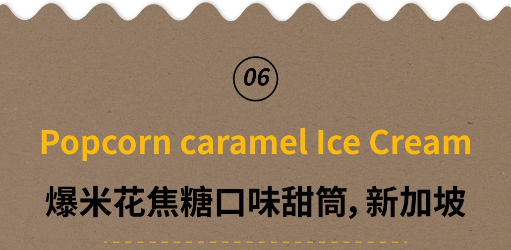 最后,我们“请”到了东南亚国家——新加坡来收尾,新加坡在去年年初为庆祝新年,推出了爆米花焦糖口味甜筒。我比较好奇的是,爆米花本来就有着特殊的焦香味,再加上焦糖的话会产生什么化学效应呢?可惜应该没有机会尝到了。