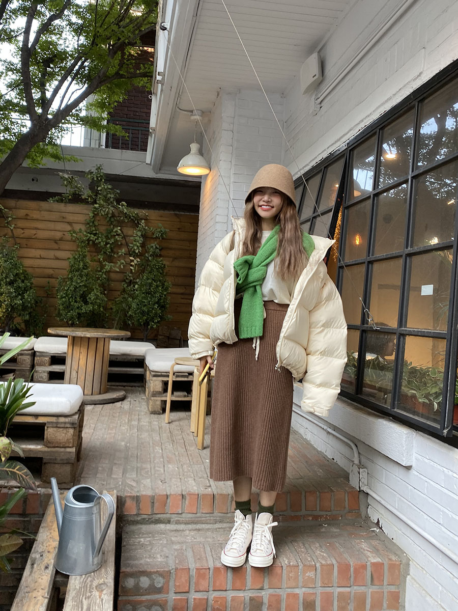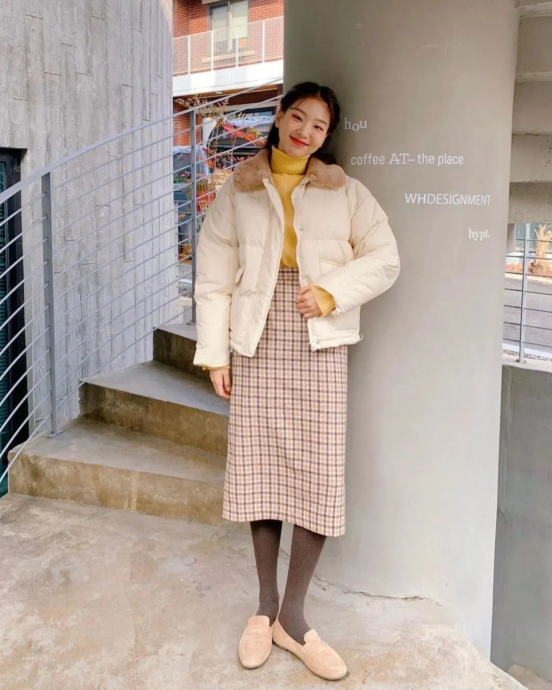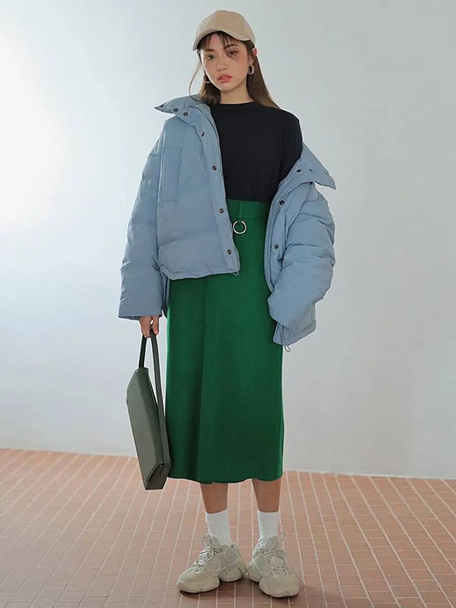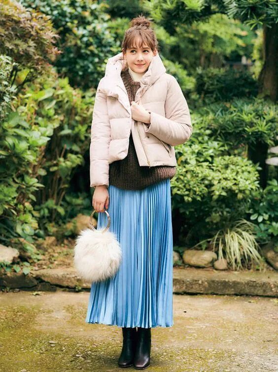 其实羽绒服搭配起裙子来更能让人眼前一亮,但是我们穿得时候容易视觉集中在下半身的裙子上,重心下移从而显矮显敦实。
