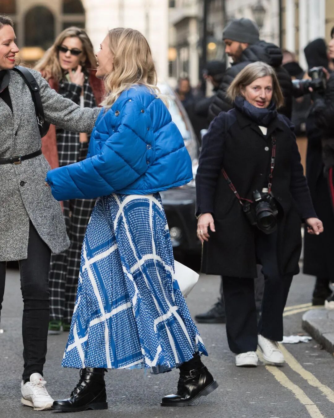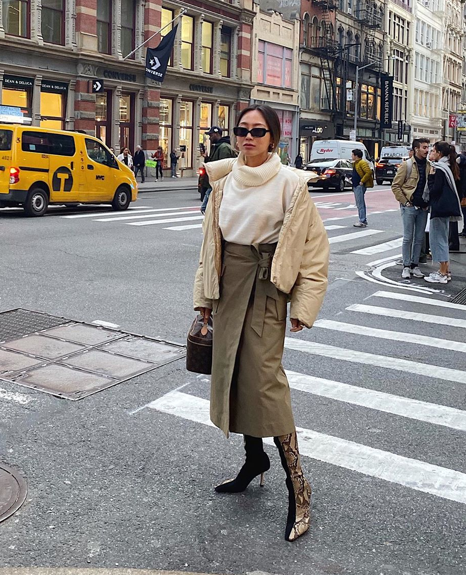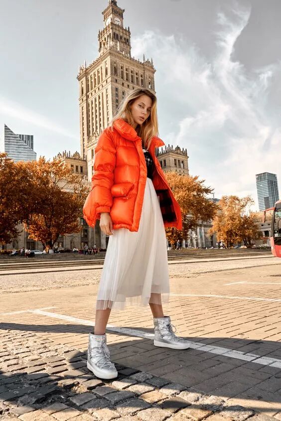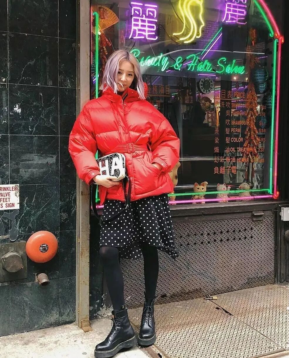 除此之外,裙长也挺重要,对于长款羽绒服来说,裙子不要超过外套。
