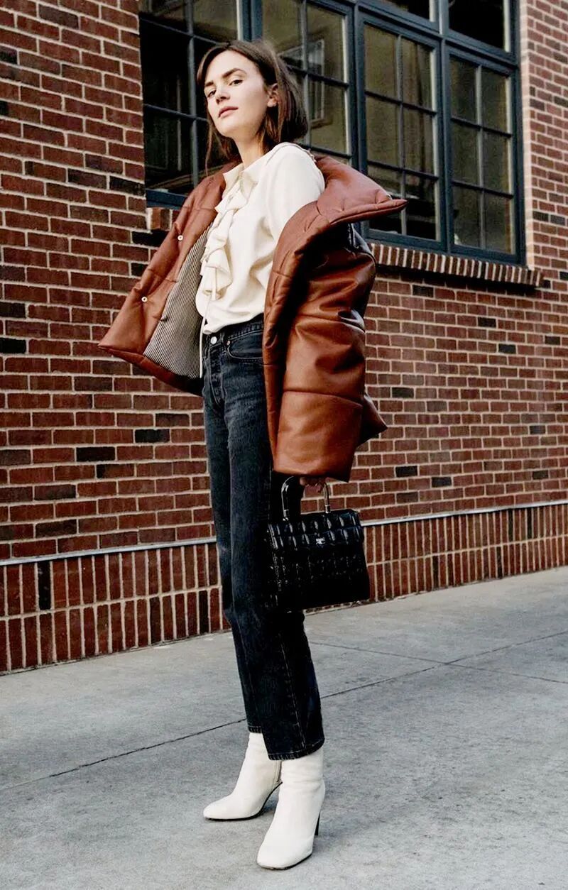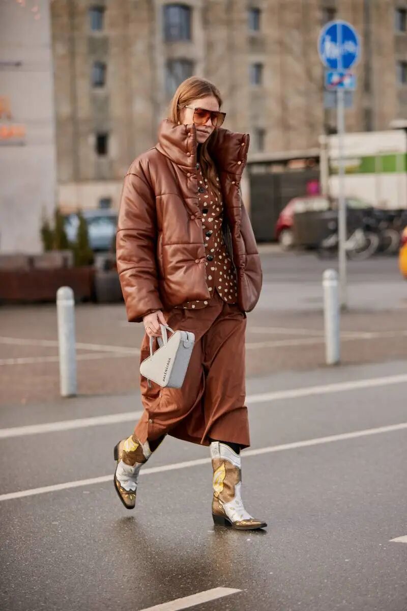 短款羽绒服+紧身裤+靴子,亮色或是夸张款的短款羽绒服,能够轻松将他人的目光吸引到上半身来,从而显得更为高挑。上半身的膨胀感可以更加突出腿部的纤细,穿上紧身裤你也能做街上腿最细的仔。
