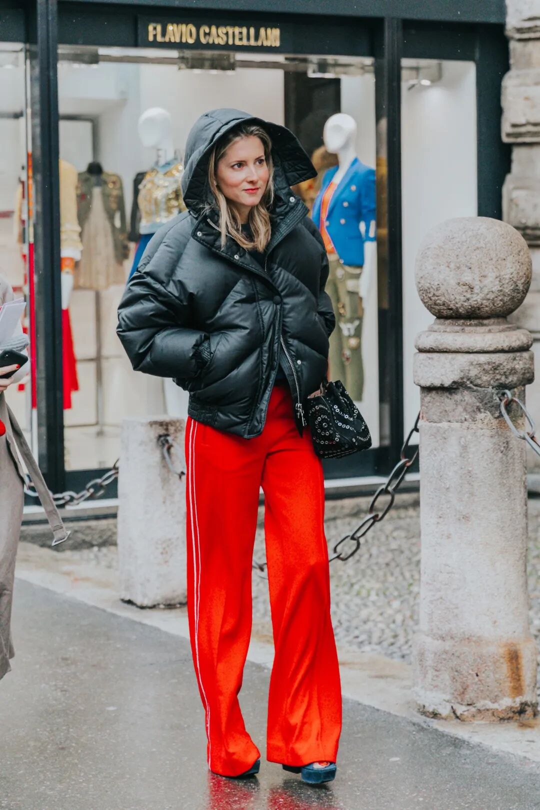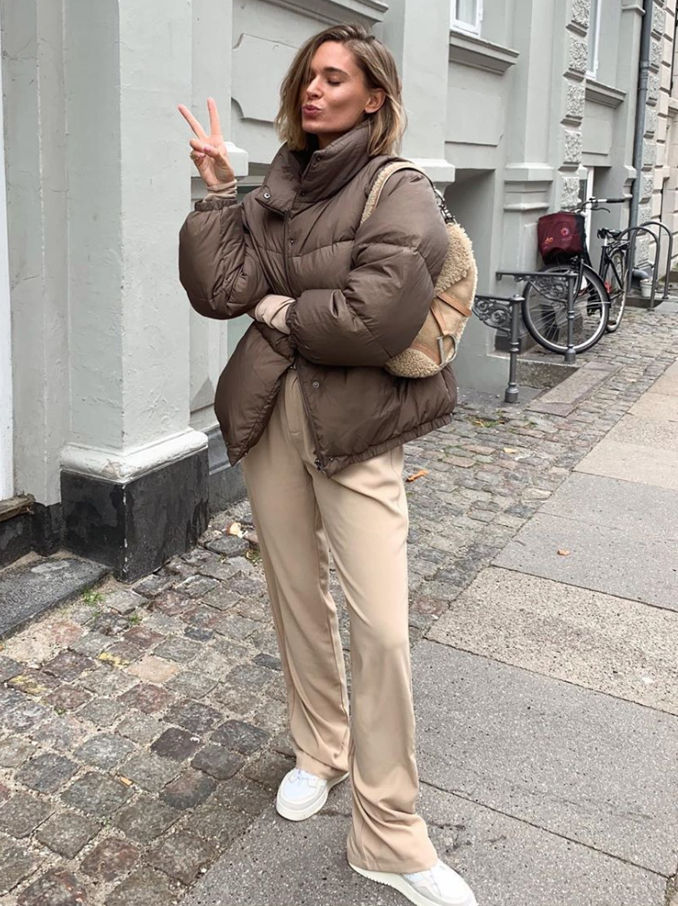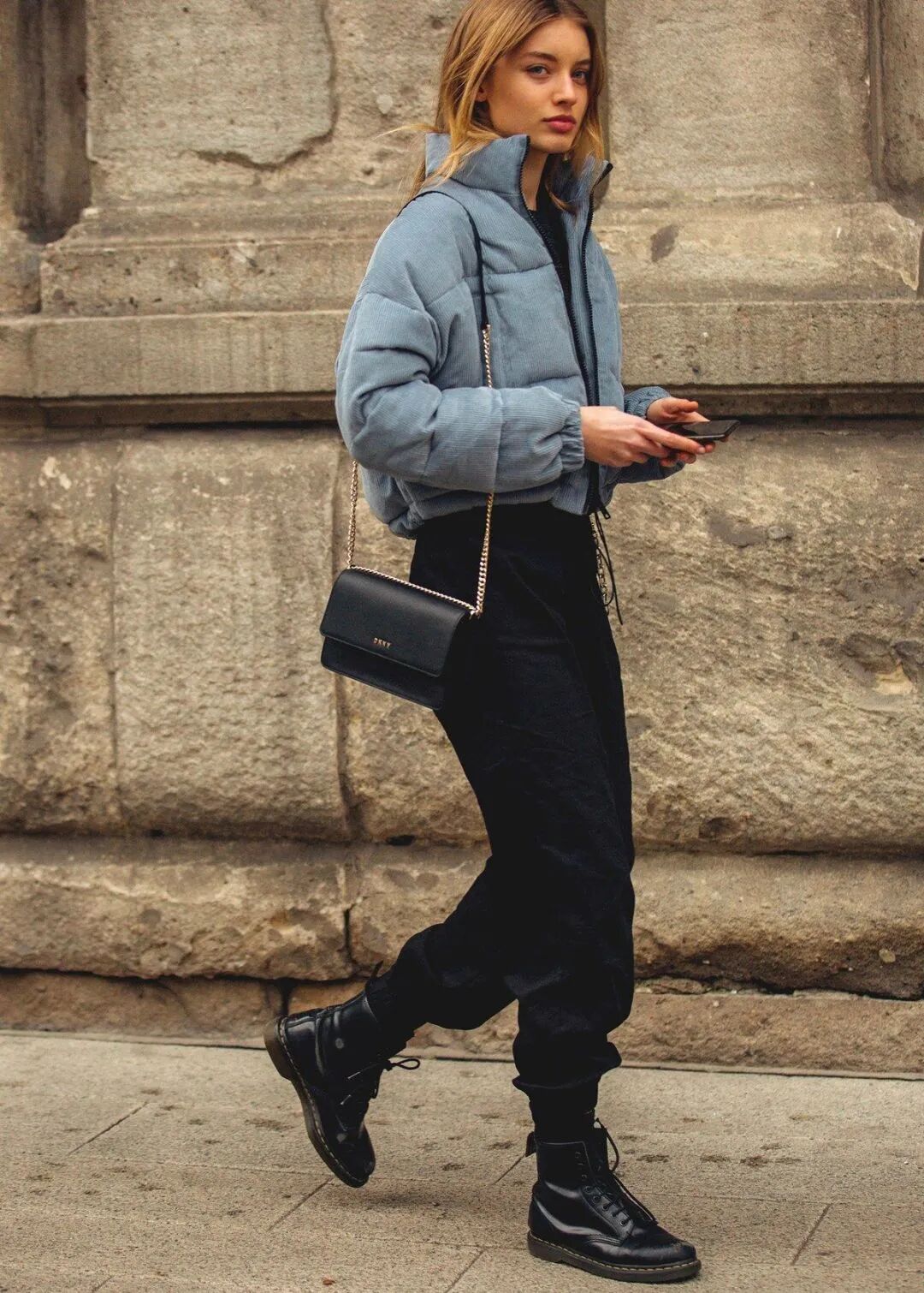 短款羽绒服本身属于短胖型的,不建议再和重量感强的单品搭配。所以说,裤装是羽绒服的最佳拍档!尤其是高腰裤,打造上短下长,身材好比例一下子就有了。