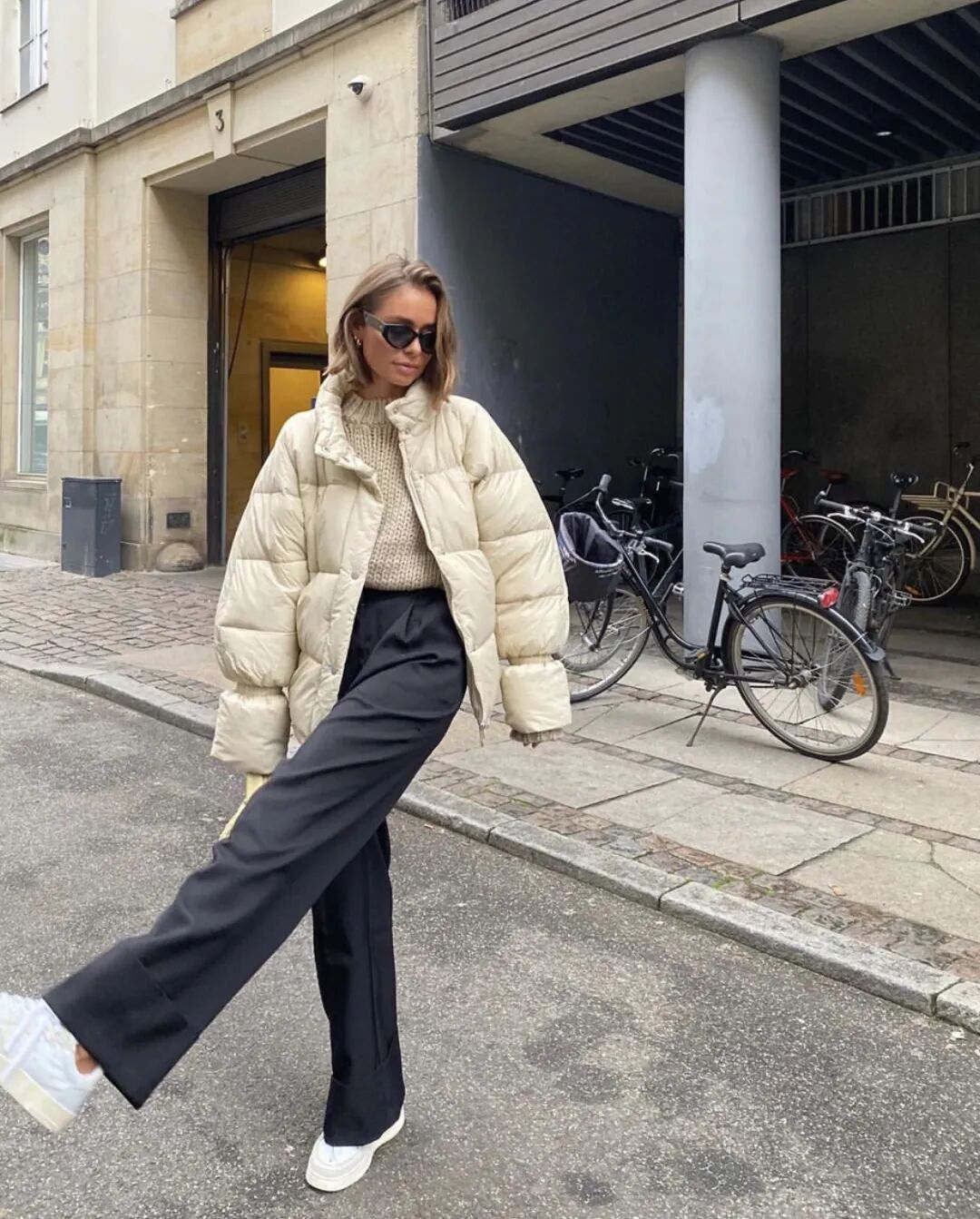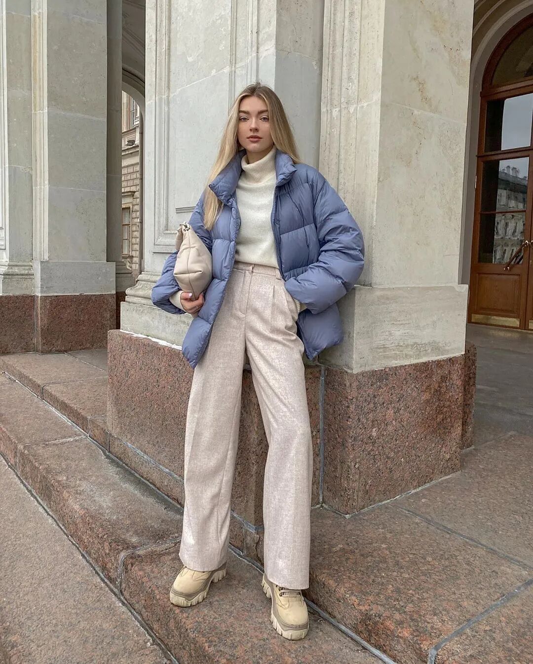 九分裤的长度可以让脚踝处显得利落十足,搭配一双小短靴,为松垮羽绒服Look做上一个精致ending,帅气不失气场,小仙女们上班也能魅力十足。