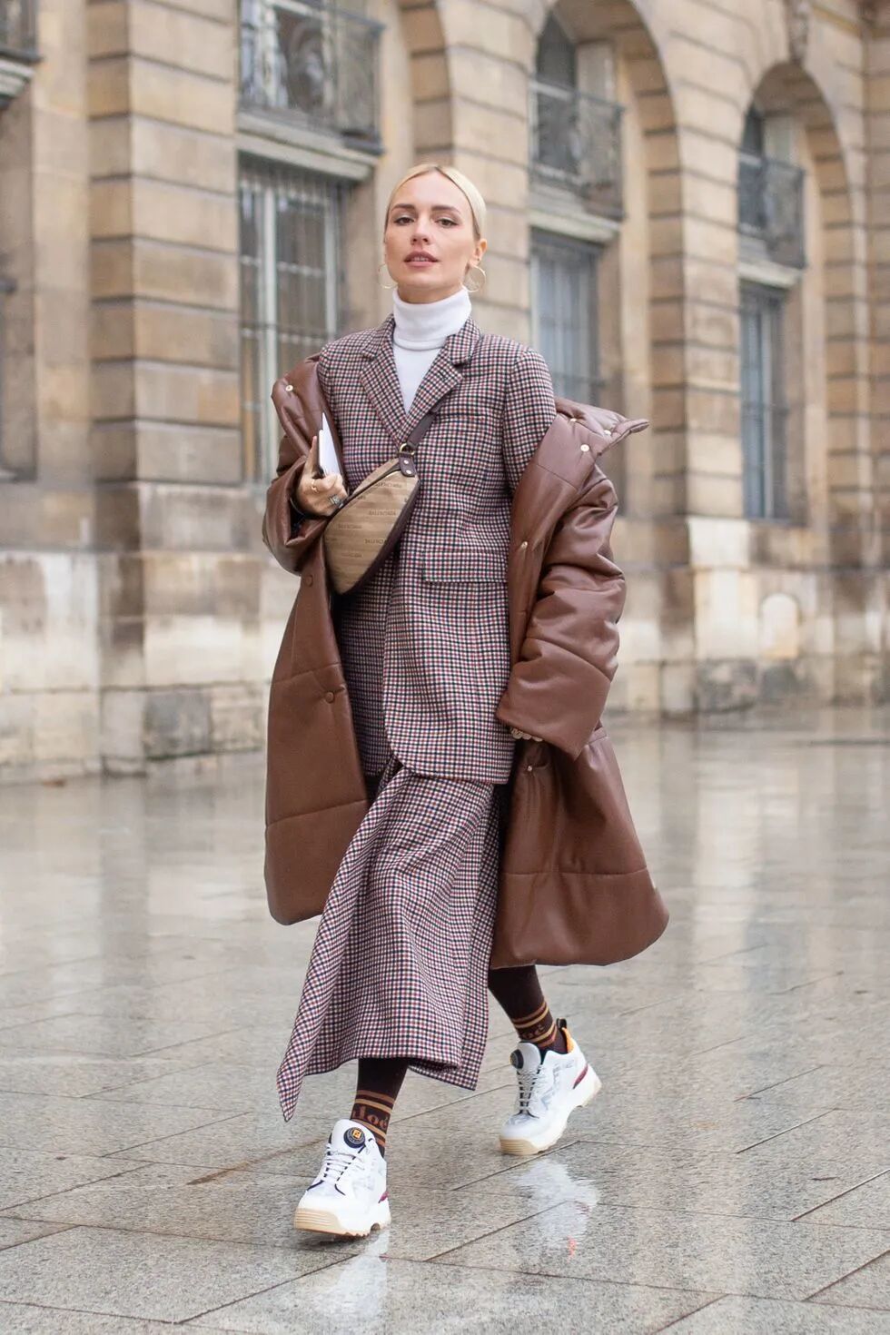西装套装+羽绒服的穿法集实用和气场与一身,满足上班女郎室内室外的风度和温度,两者的同色呼应,无形中再为这一套增加不少质感。