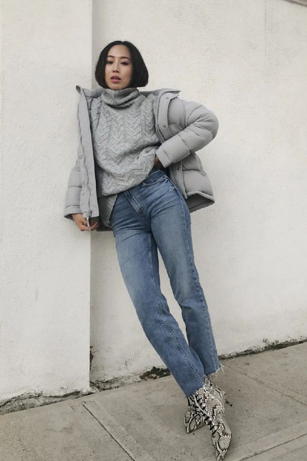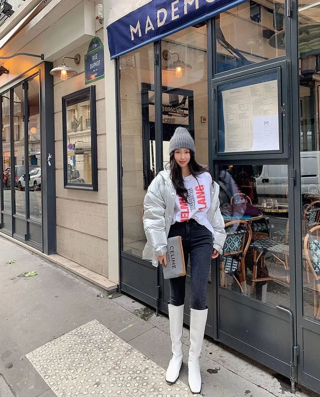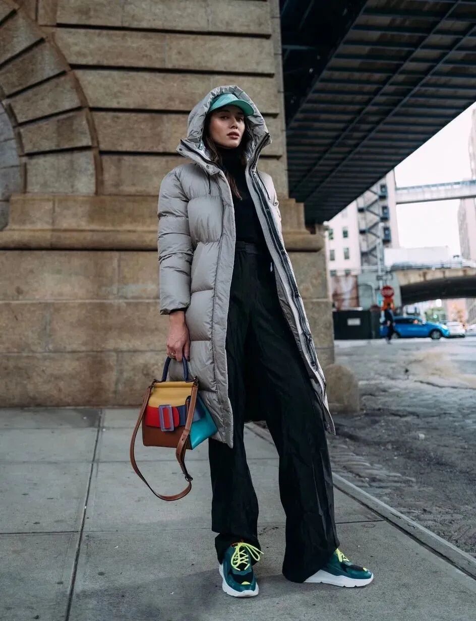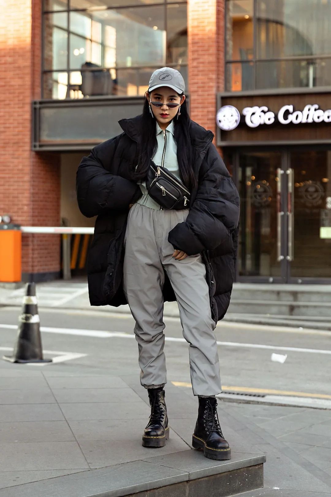 怕麻烦的小伙伴就可以直接用长靴或者运动鞋与羽绒服衔接,全身只有羽绒服和鞋子,比例大概是9:1,两者相互衬托却并不强彼此风头。