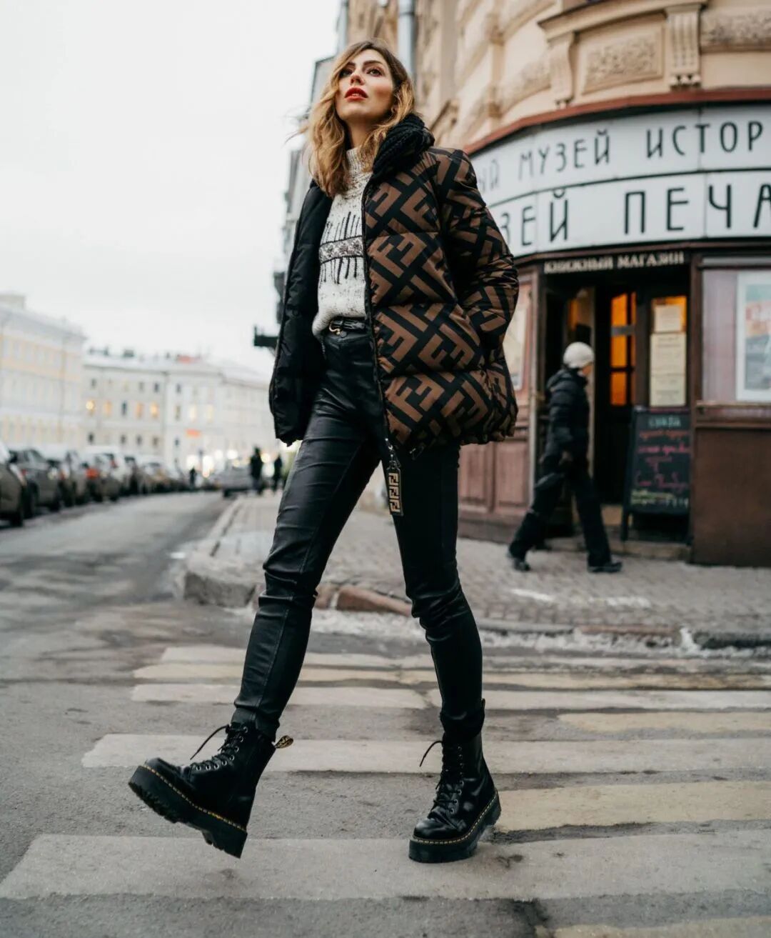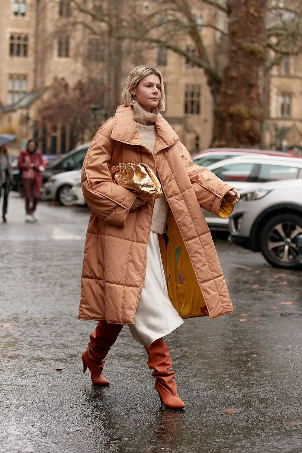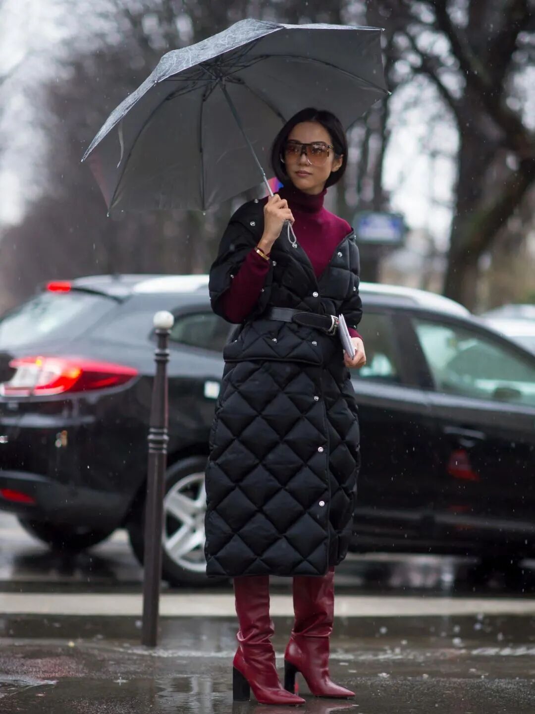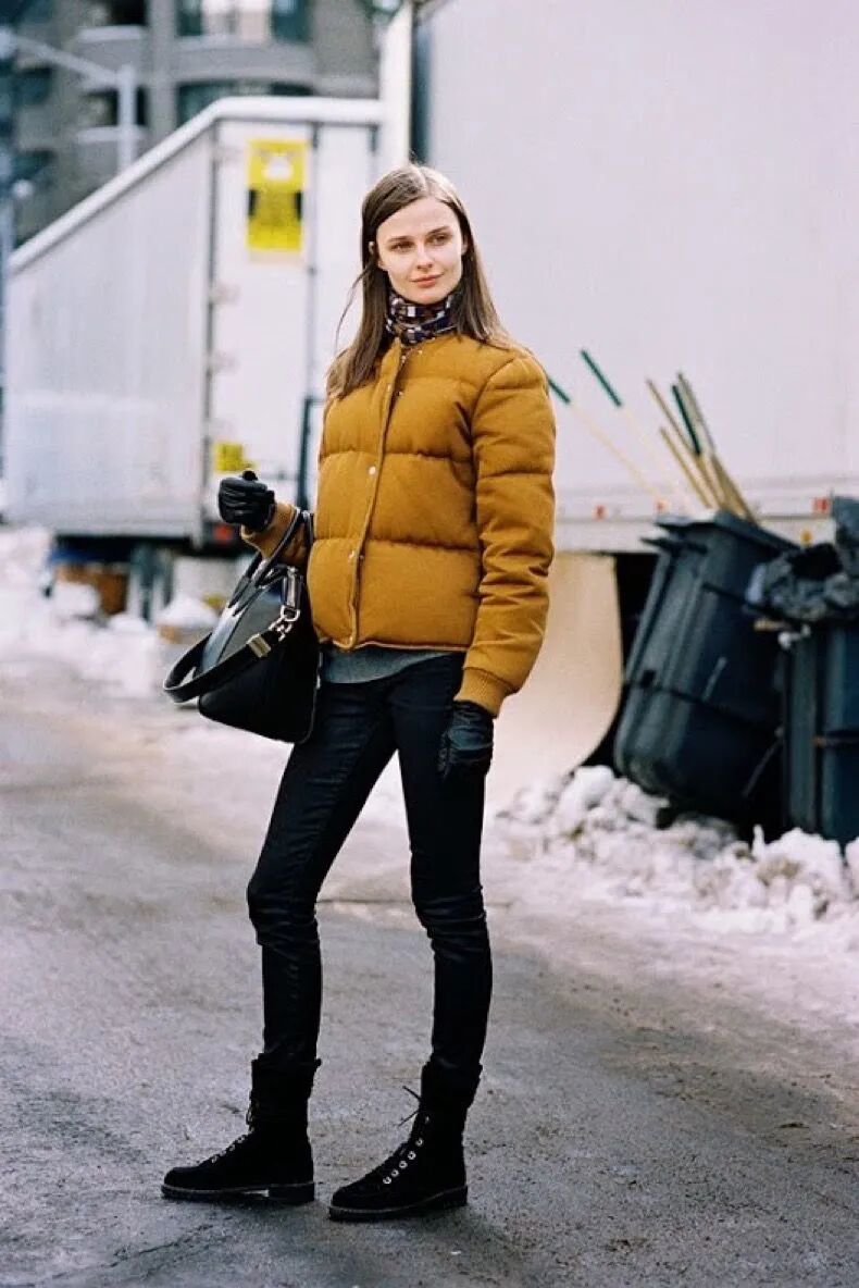 怕麻烦的小伙伴就可以直接用长靴或者运动鞋与羽绒服衔接,全身只有羽绒服和鞋子,比例大概是9:1,两者相互衬托却并不强彼此风头。
