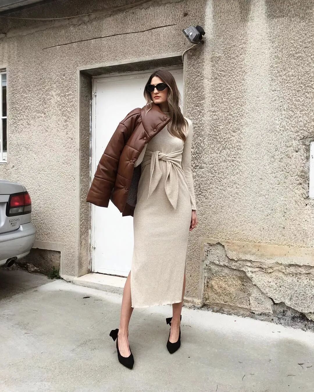 如果是连衣裙,除了可以选带腰间设计的款式,也可以用短款羽绒服的衣摆来作为腰间的分界线,长短分明。