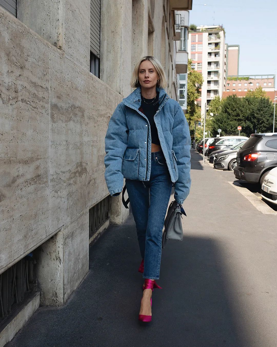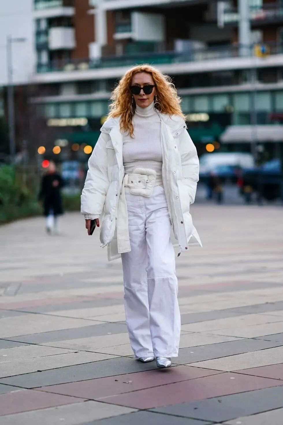 最后一个办法就是加大内搭的颜色比例,比如,用围巾和裤子同色、打底衫包包鞋子呼应,这样视觉重点就从厚重的羽绒服转移到了内搭上,整体看起来更轻盈有时髦感。