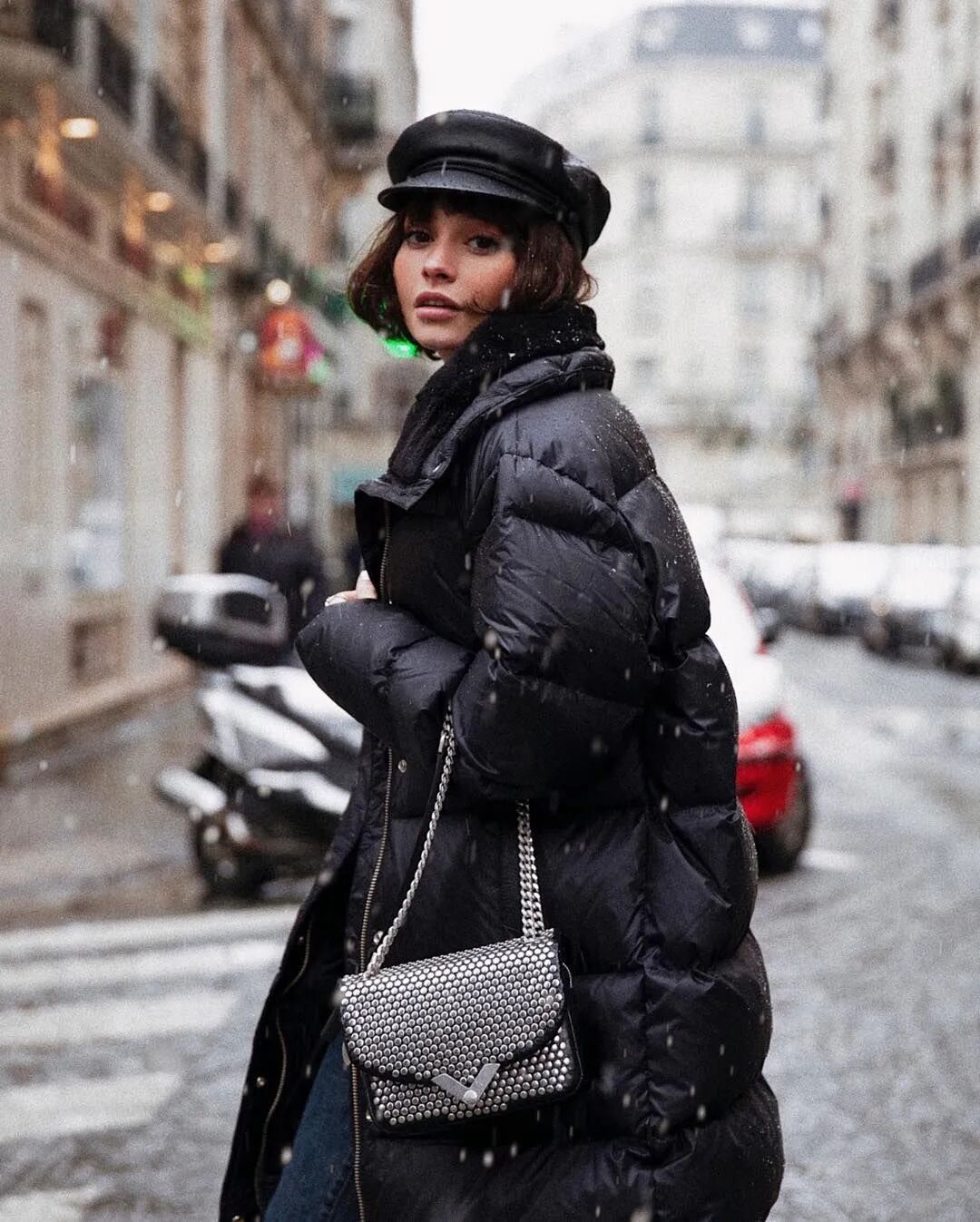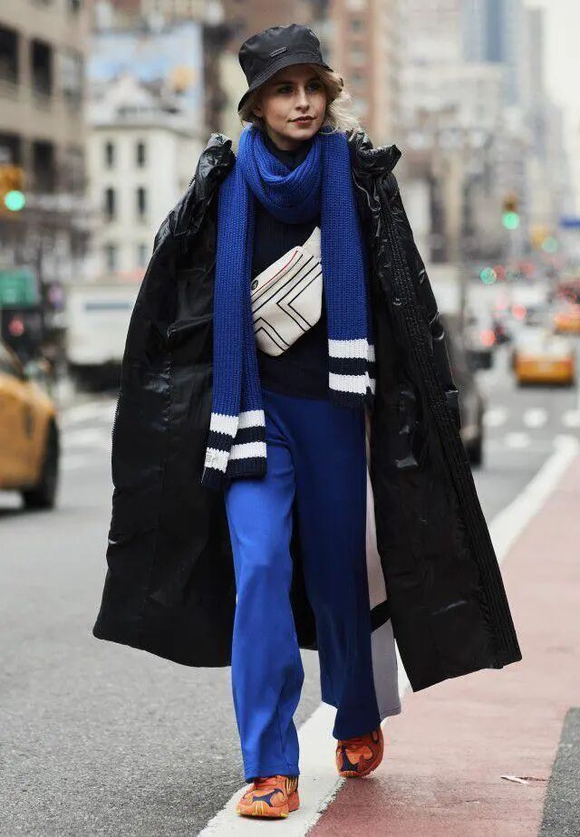 穿羽绒服时,像耳饰项链这类细小精致的首饰基本都被淹没了,更聪明的办法是靠围巾、包包、帽子这样的大件配饰来吸引眼球。