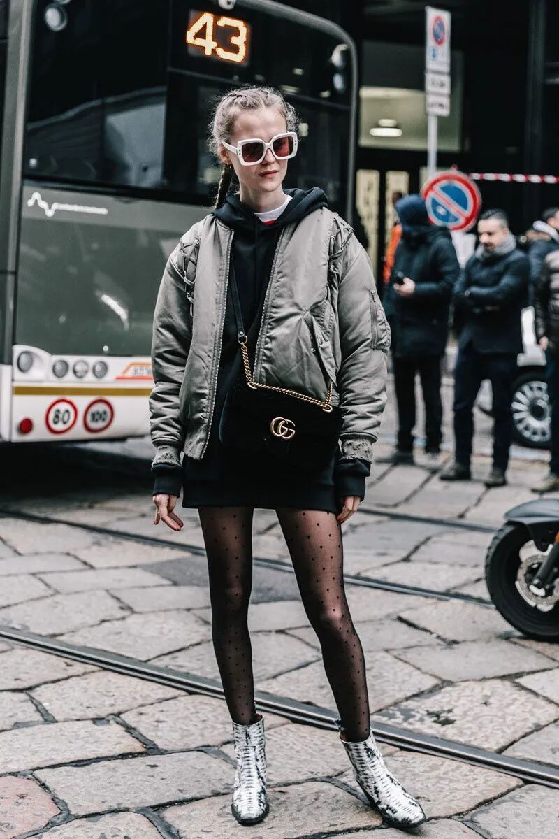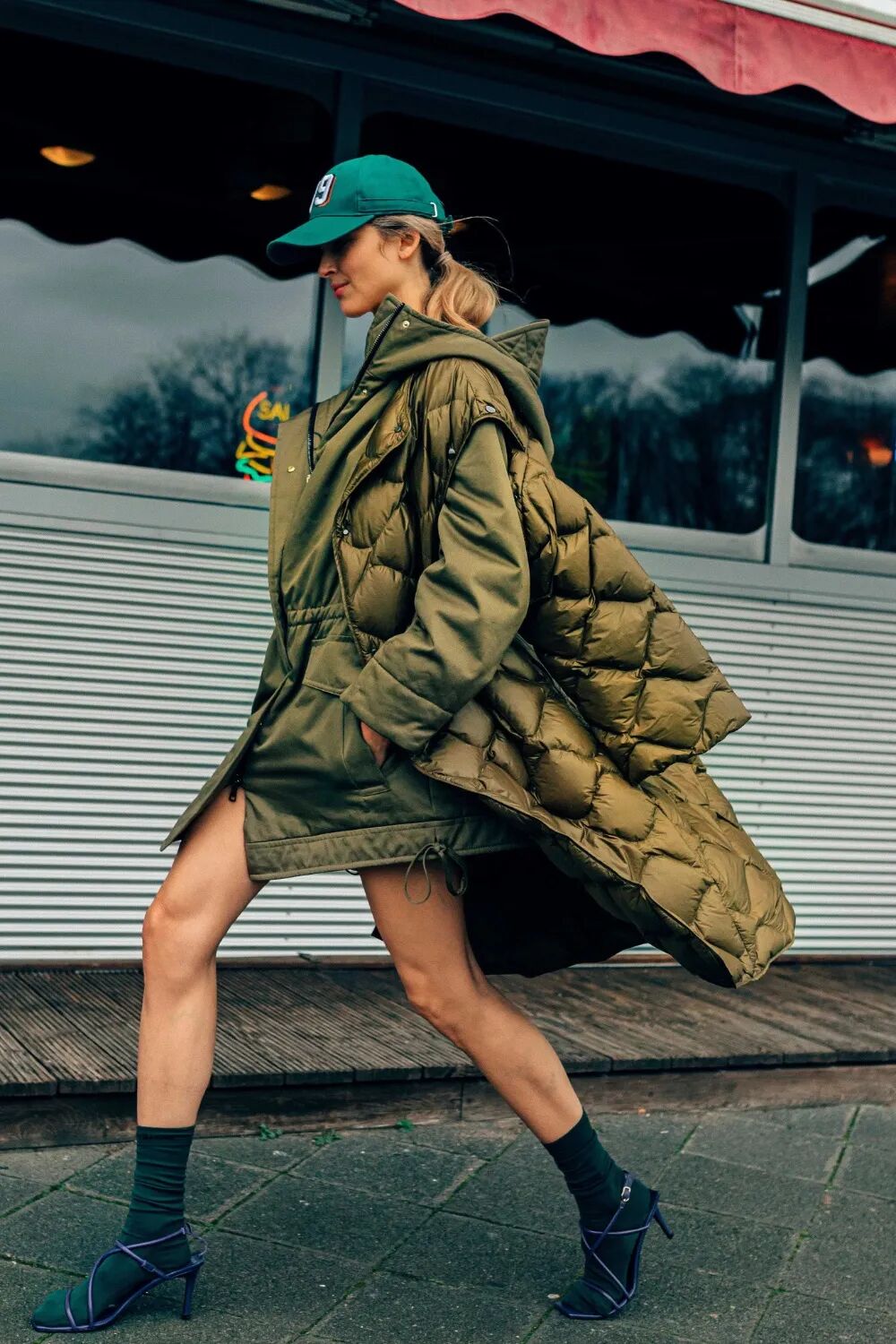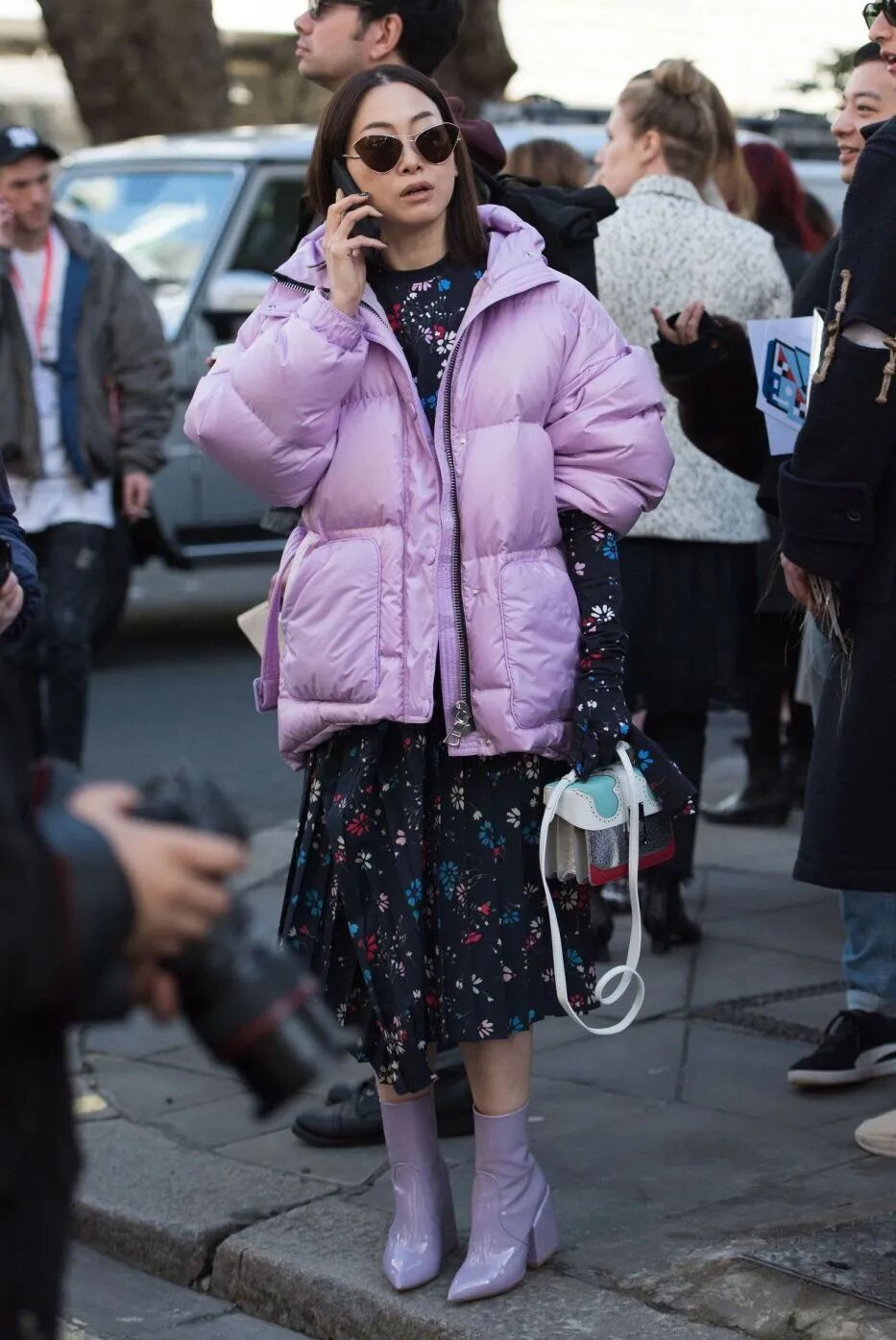 或者是,在保证内搭足够保暖的同时,将羽绒服当做露肩外套,扯下一角或者直接露出内搭来穿。