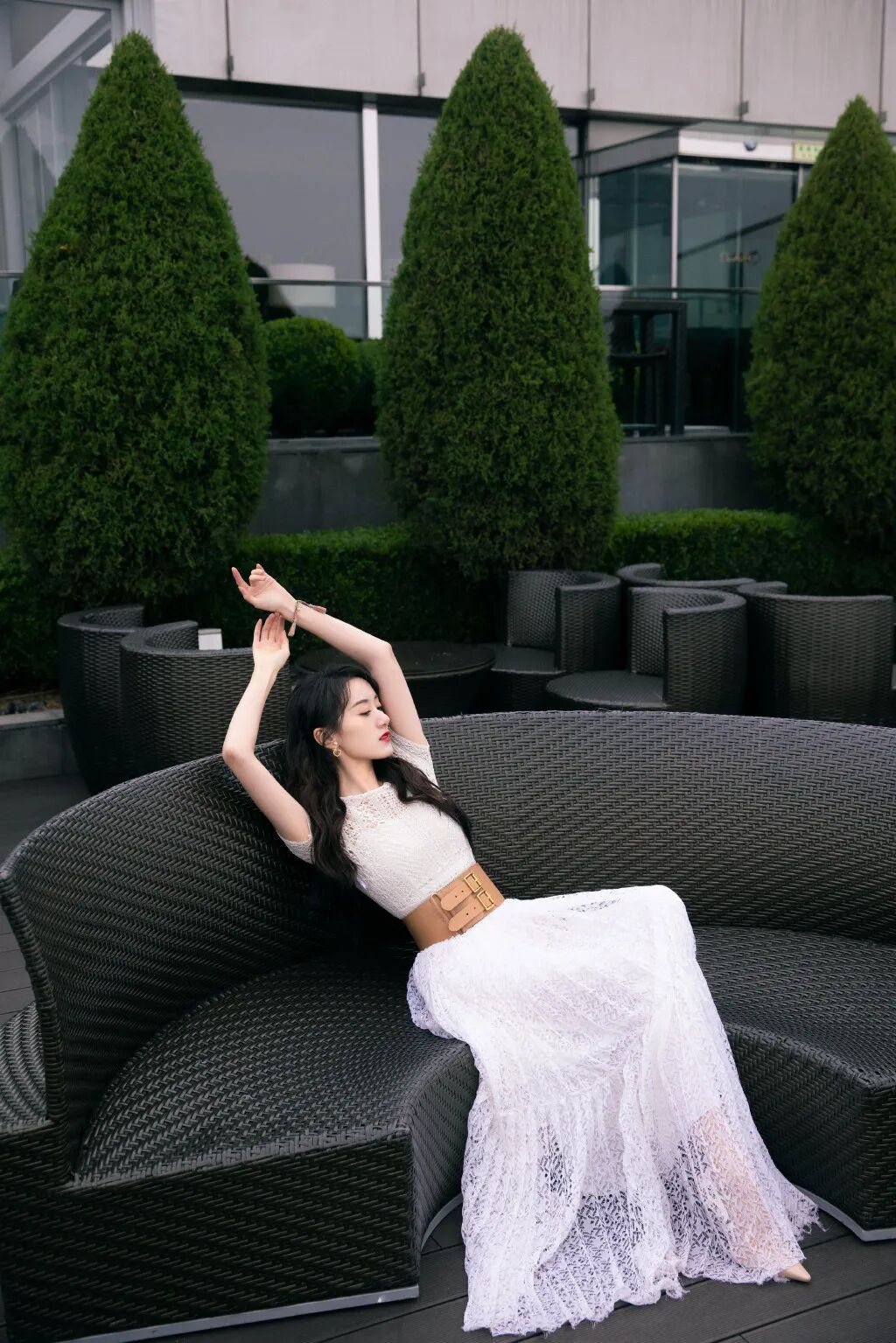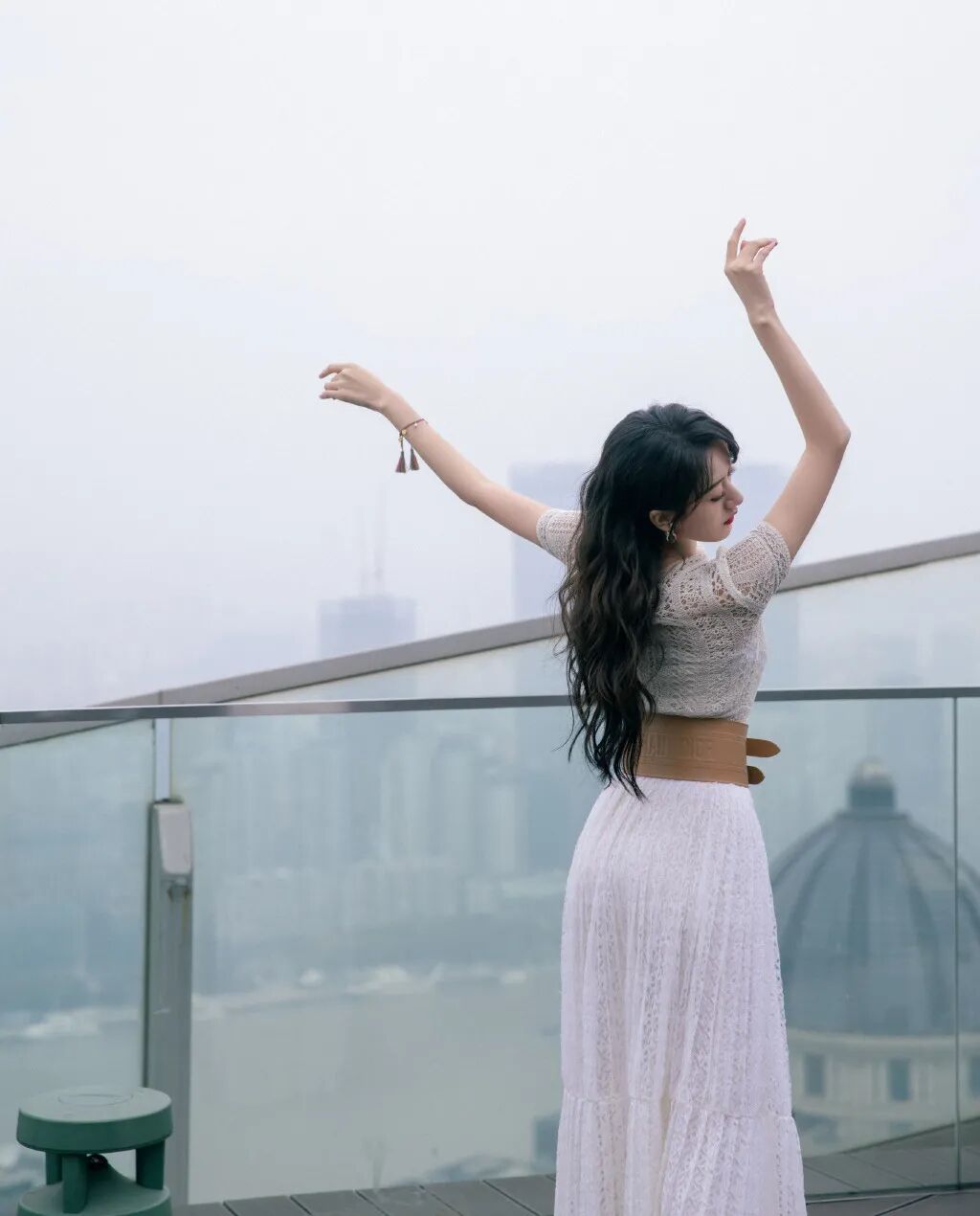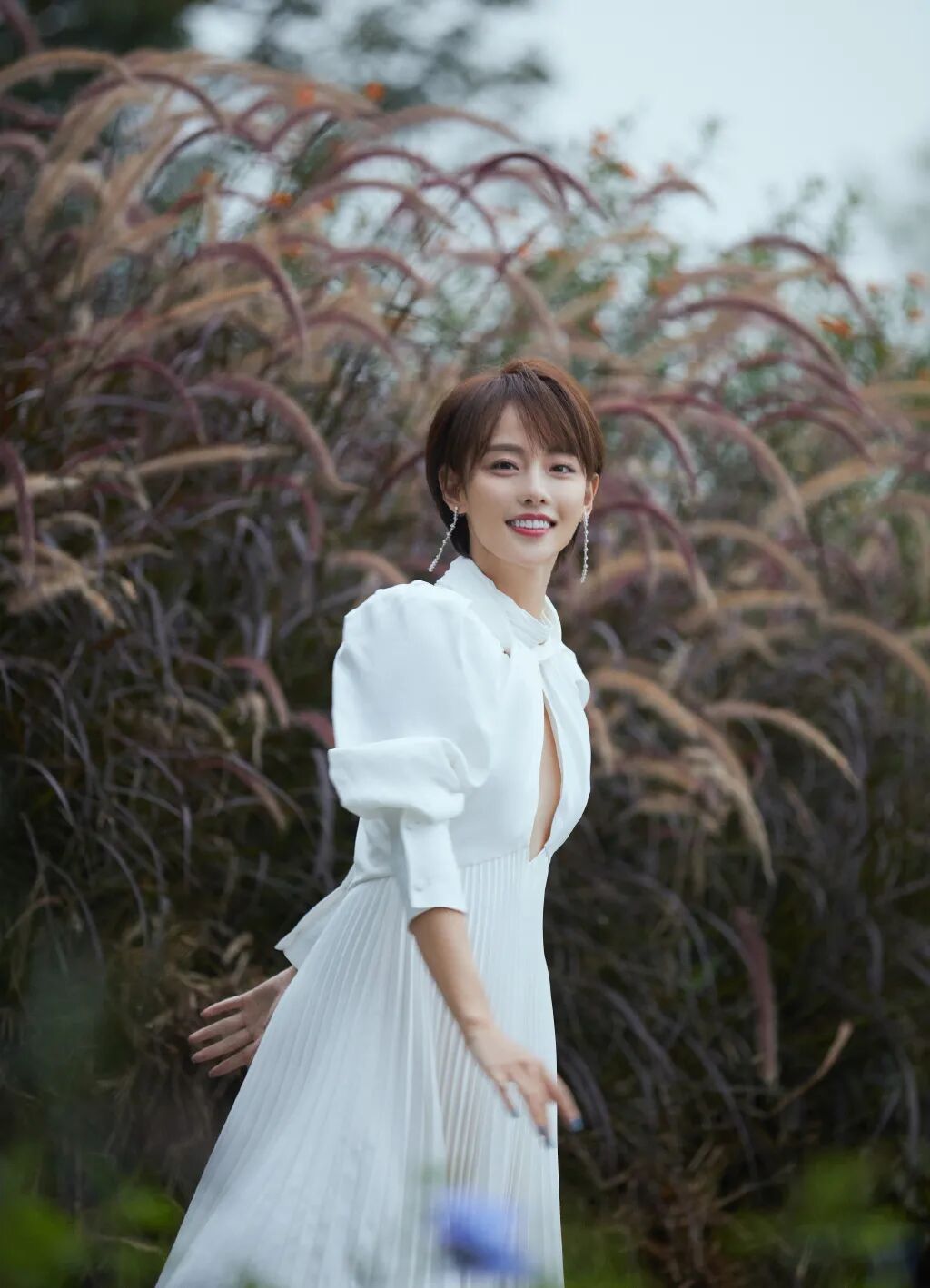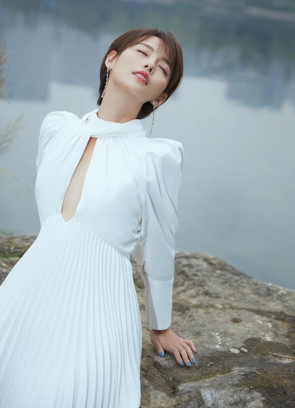 这身不对称挖剪褶裥绉纱连衣裙在张嘉倪的演绎下更添几分仙气,在湖光水色间你是另一种心动。