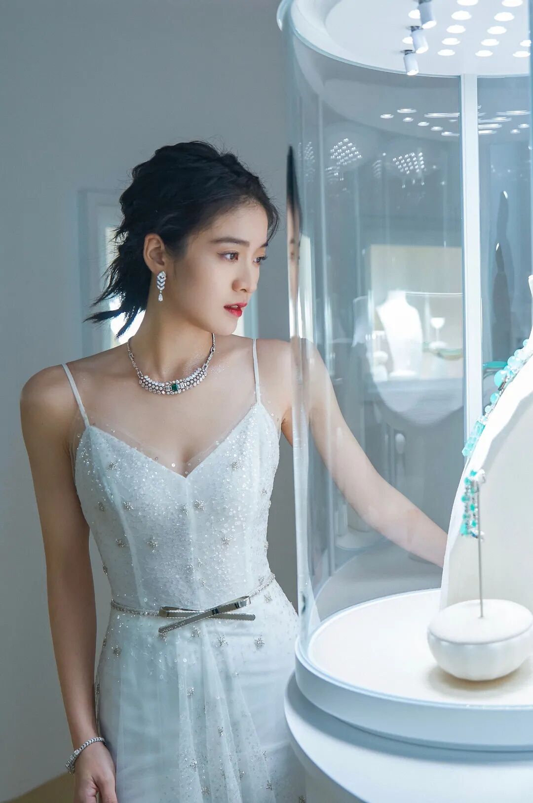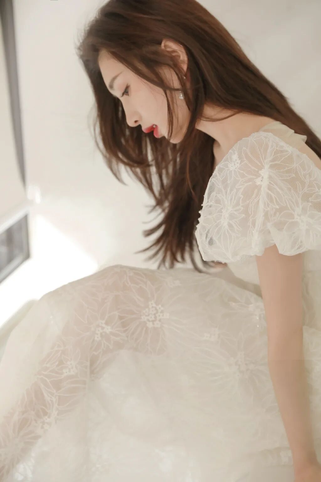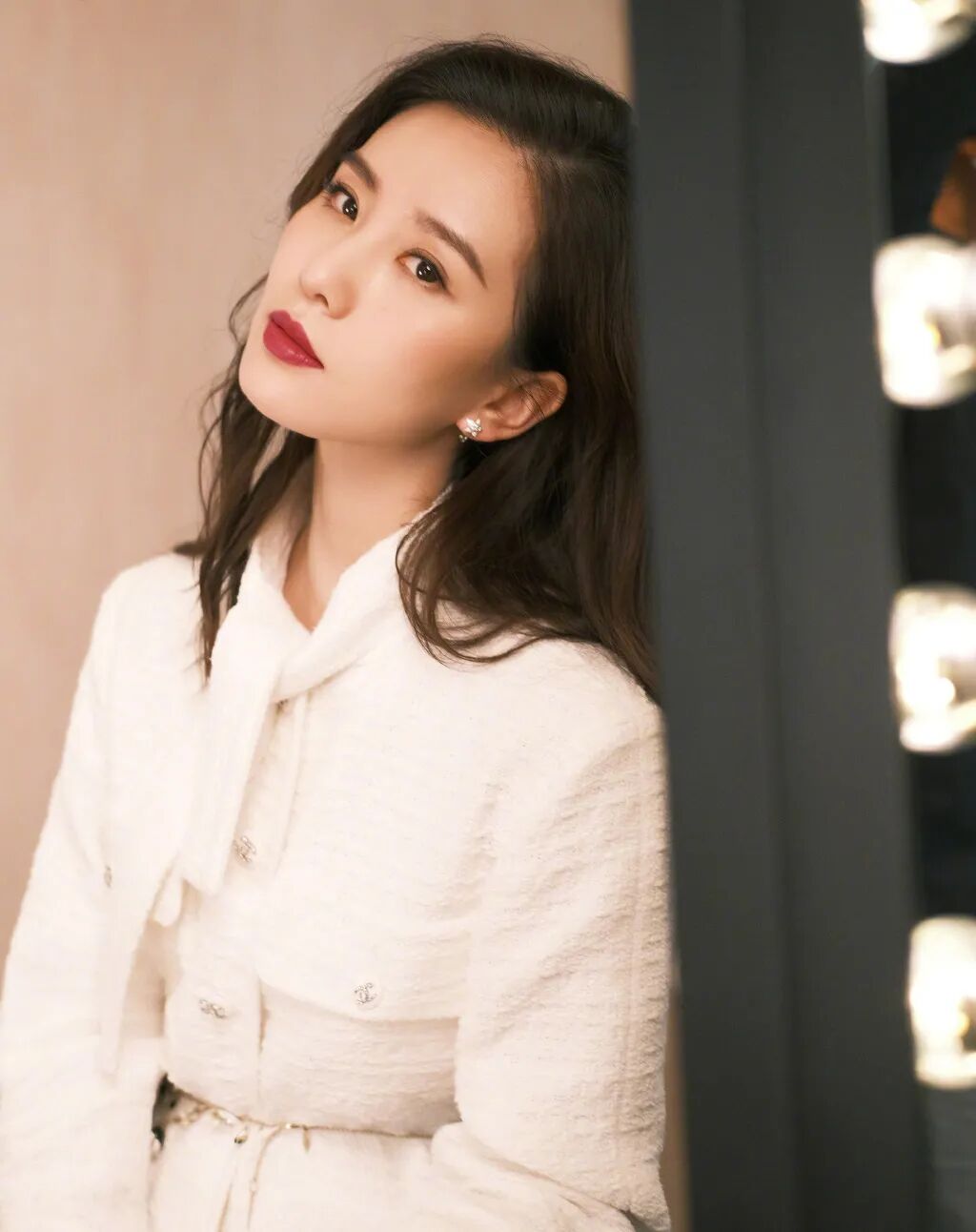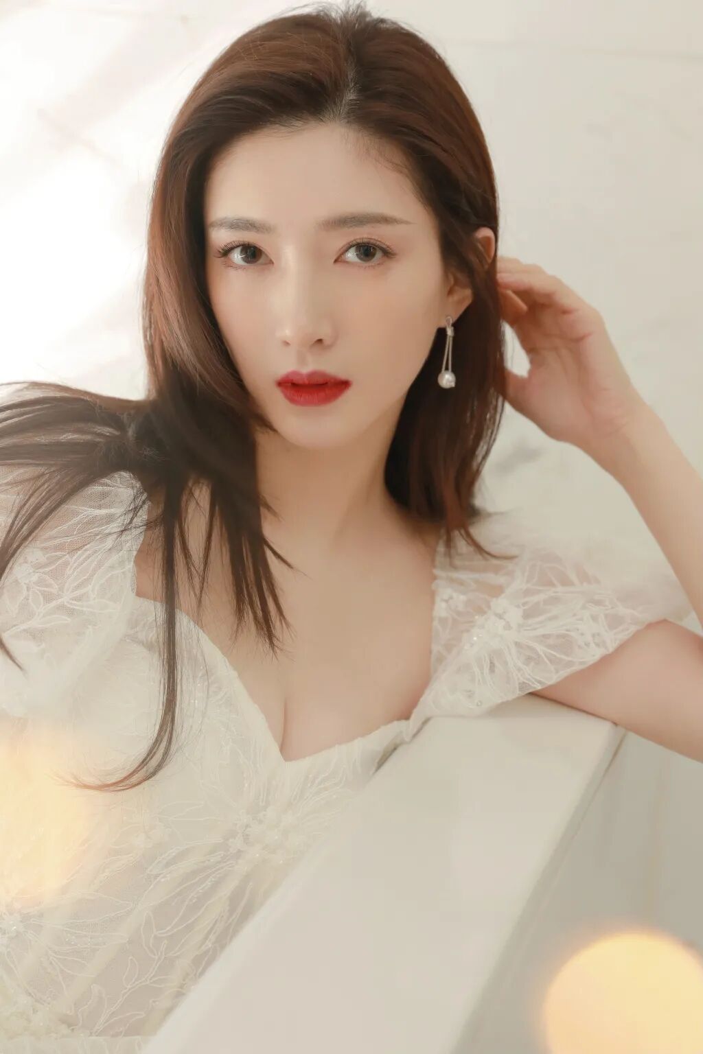 江疏影这身白纱裙可谓是月宫仙子降落世间,薄施粉黛的面容依旧高雅清丽,斜倚池壁,顾盼生辉。