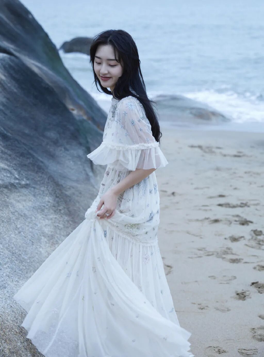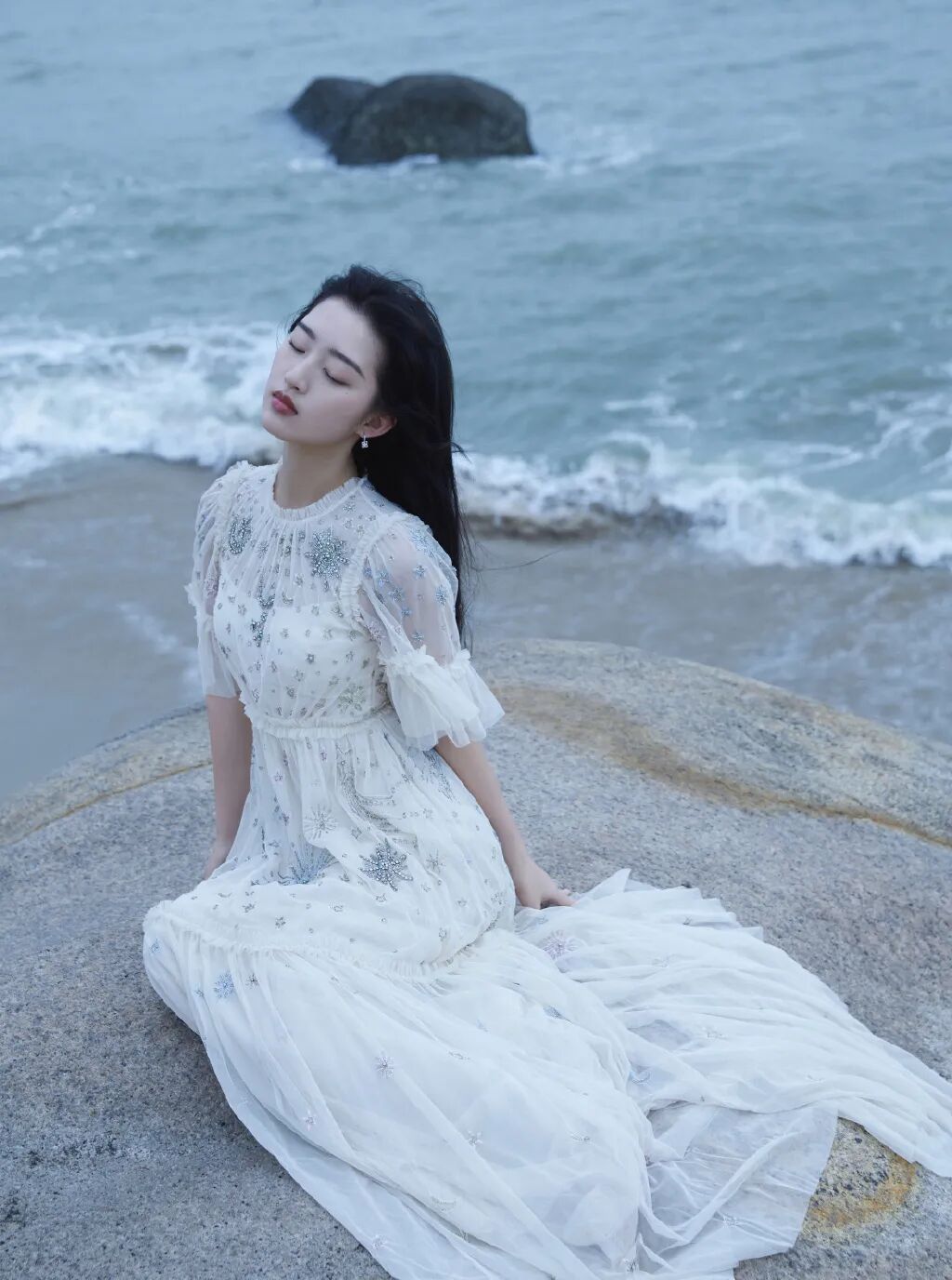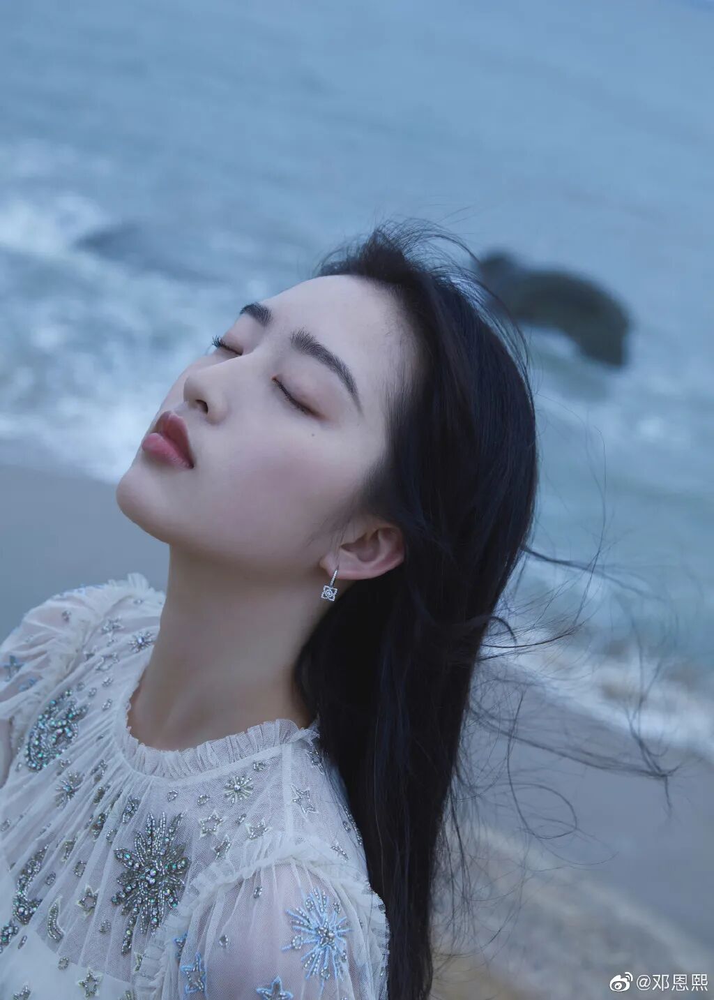 厦门的海滩边,礁石上一身唯美白色网纱裙的邓恩熙宛若海的女儿,在微风的拂动下蹁跹起舞。