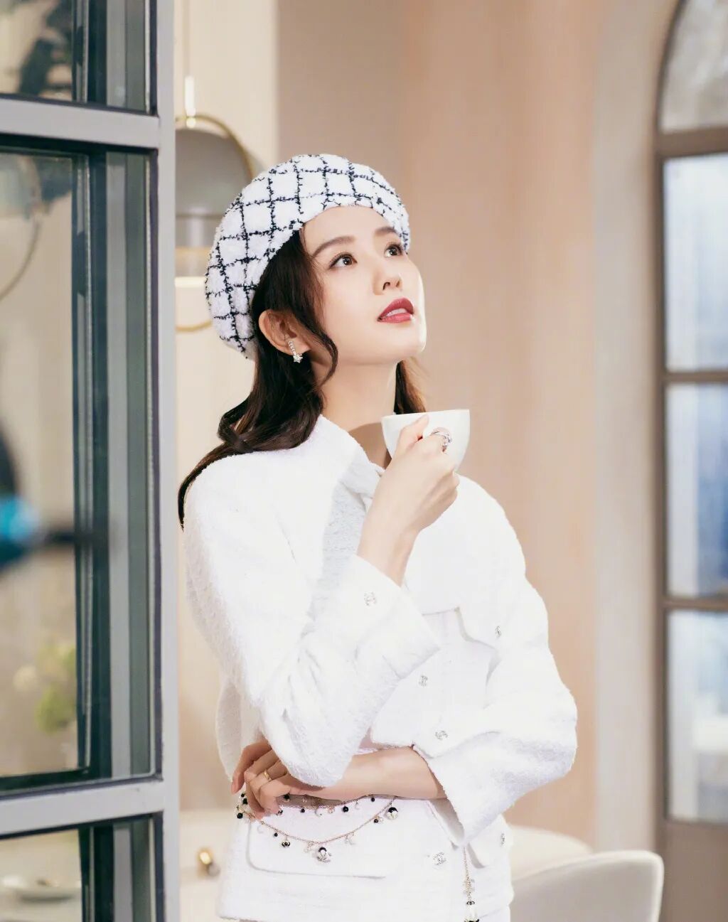 身着纯白粗花呢外套,搭或不搭黑白格纹的贝雷帽,小香风的气息都扑面而来。