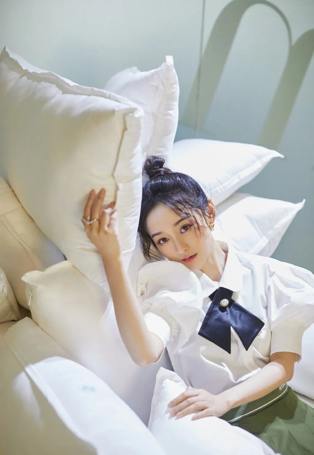 泡泡袖加上黑色交叉蝴蝶结的白衬衫,搭配暗橄榄绿的百褶裙,日系文艺小清新的味道在何泓姗身上体现得淋漓尽致。