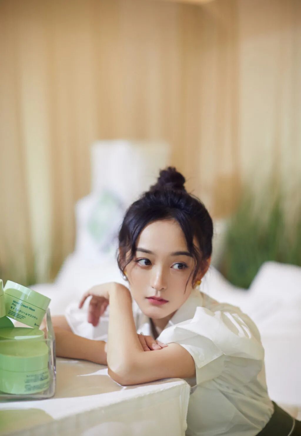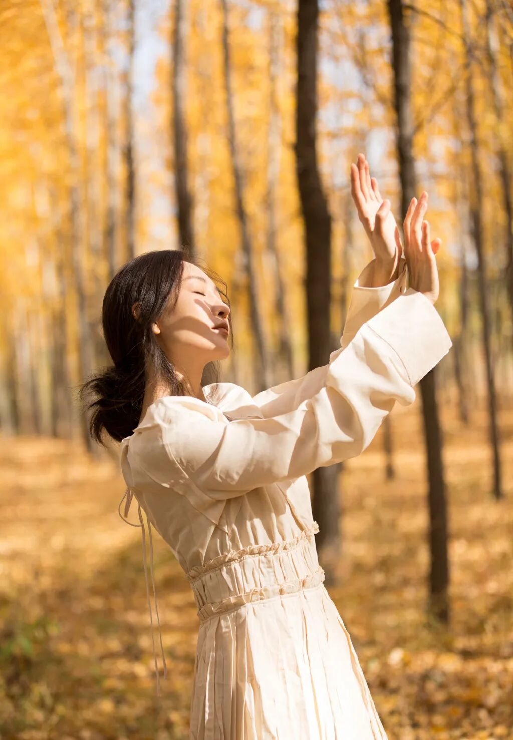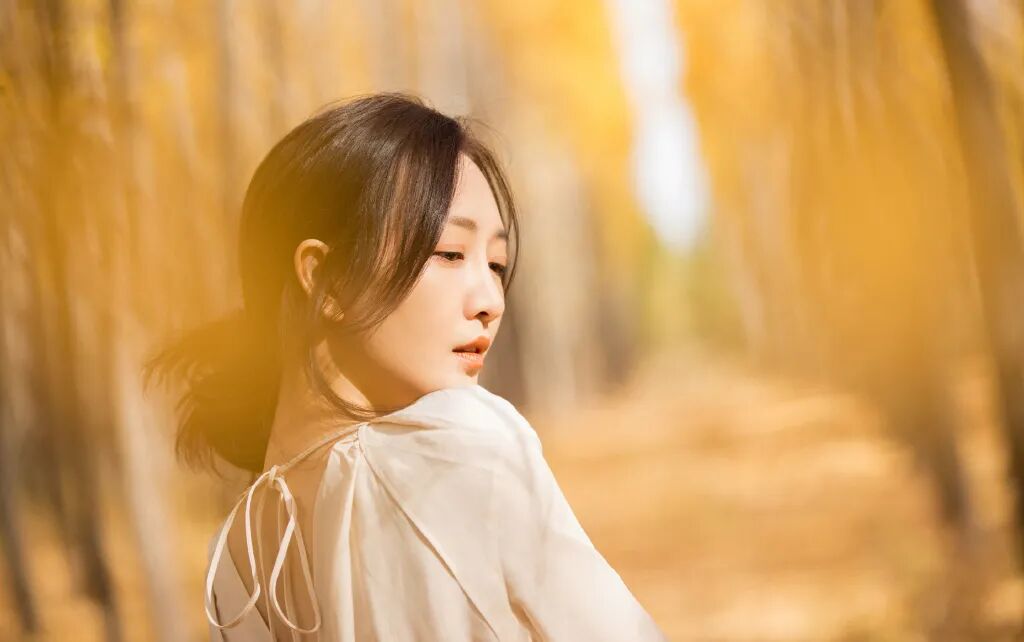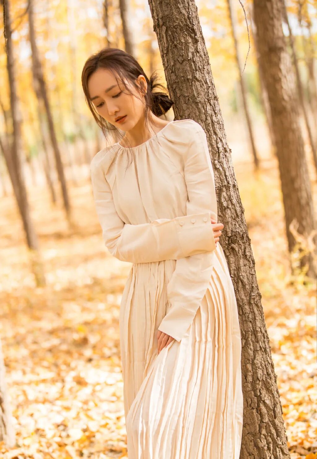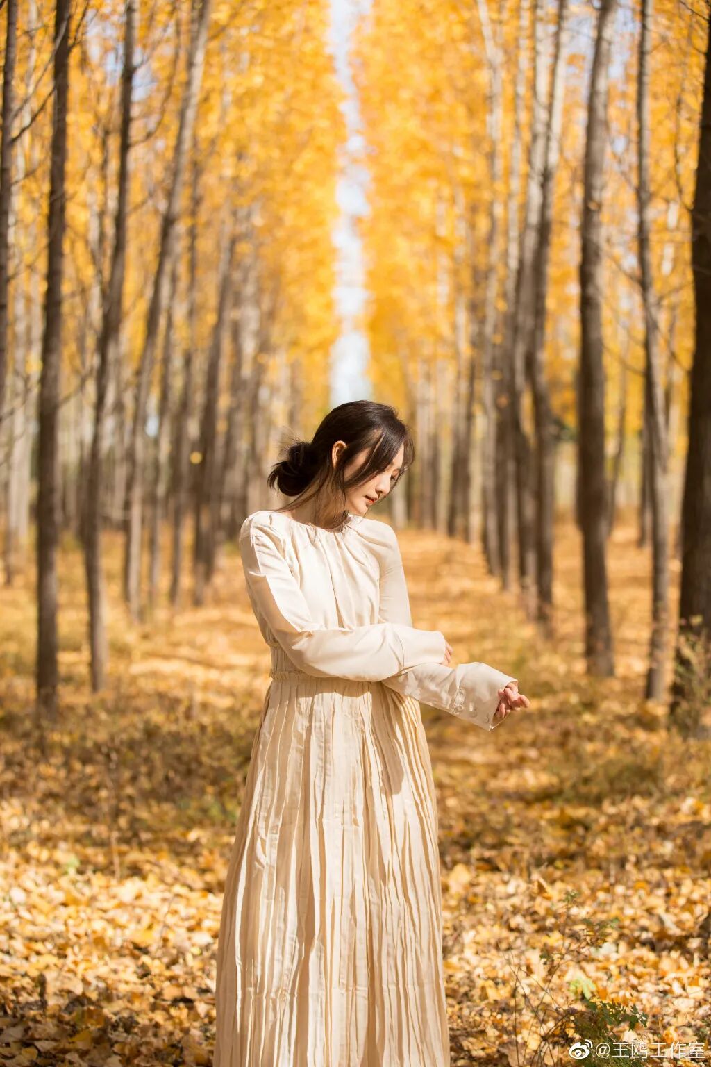 头发无须规则地束起,稍有错落感更显放松状态下的慵懒温和,让王鸥带你走进这片金灿灿的小森林吧。
