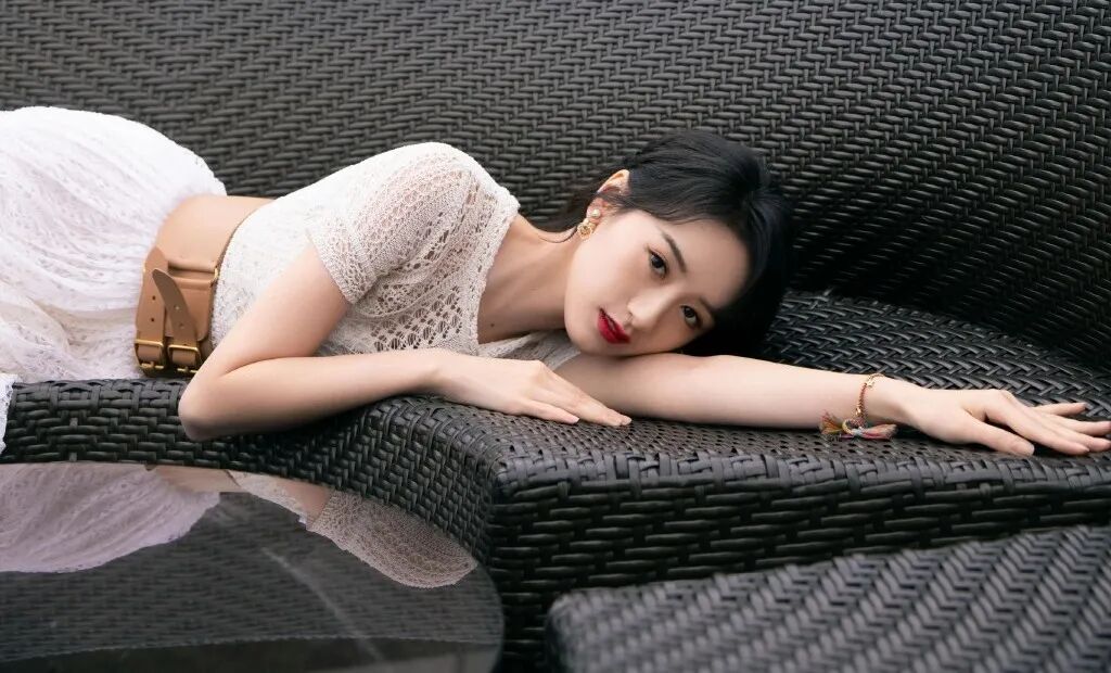 张雪迎在这身浪漫却不落俗的吊带轻纱裙里,散发出温柔少女的气质。
