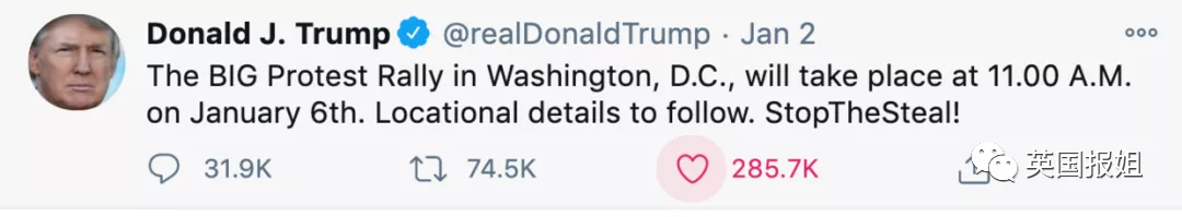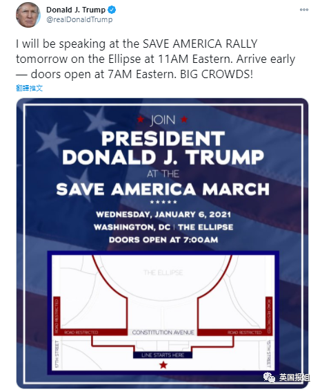 “推特治国”的川普一条一条地发布着要求支持者聚集的推文,给出了时间、地点、口号。