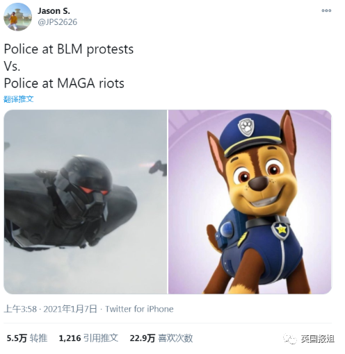 有人对比了在之前BLM运动走到国会大厦附近时,警方的严阵以待,与这次的形同虚设。