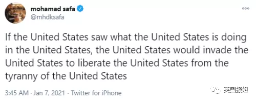 “如果美国看到美国在美国的所作所为,美国就会入侵美国,并从美国的暴政中解放美国。”