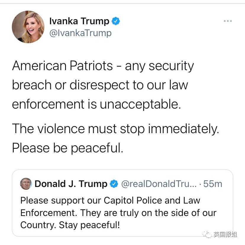 但第一个做出回应的是伊万卡——她发了一条推特,并将闯入的抗议者,称之为“Patriots爱国者”