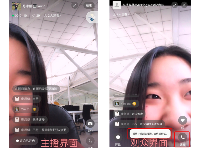 开始直播后,直播链接会自动发送至直播群聊,无法分享到别的群和朋友圈。直播时,主播方可以实时看到时长、点赞人数、观看人数、滚动评论,前后镜头可以互相切换,和微信视频一样,点击右上角的最小化,能够浏览别的聊天界面,并继续直播。右下角有连麦功能图标,但下午多次使用时,均连麦失败,可能存在bug。