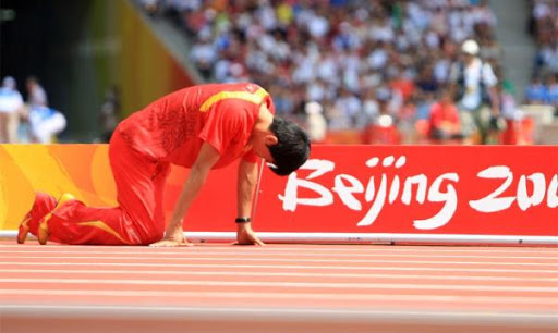跑道上,刘翔最后亲吻了自己熟悉的老伙计,伤痕累累的他,要告别这个熟悉的战场了。