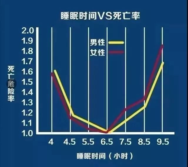睡眠时间在6.5-7.4小时之间的人群,死亡率最低,而低于4.5小时或高于9.5小时,死亡率倍增。