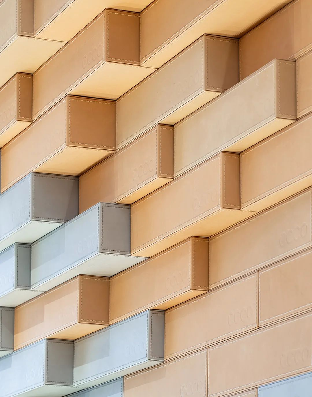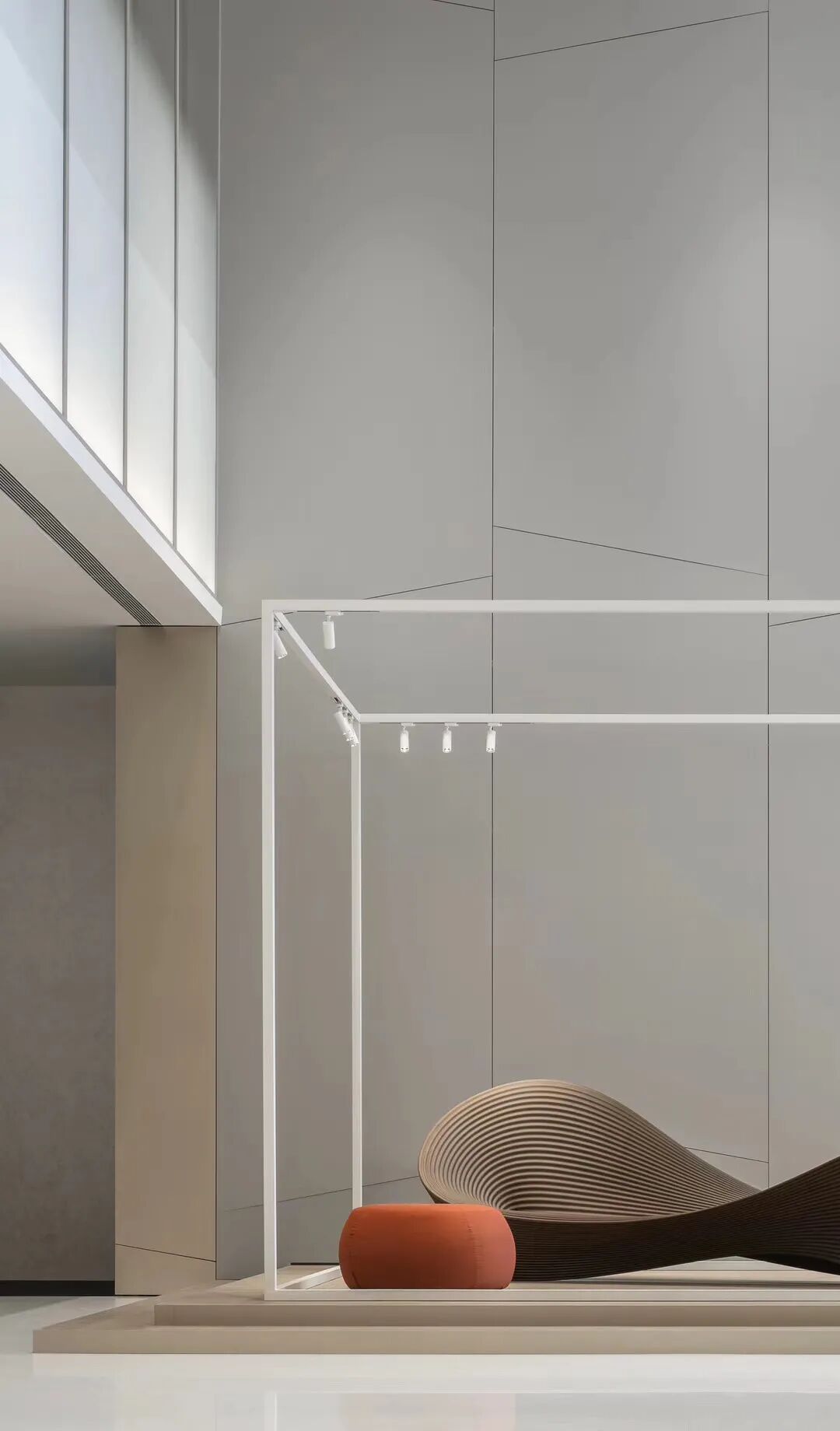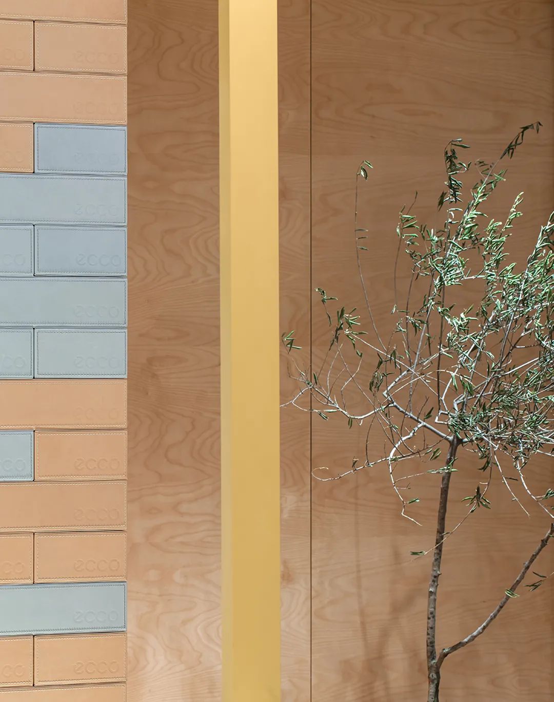 ECCO品牌的标识墙以纯粹的白色与暗光呈现,独立放置于空间一侧。设计师提炼西安斑驳古老的有形文化遗产—城墙,同时辅以ECCO精神内含的“皮革创新”,为接待区打造一面混合不同颜色的皮砖墙,以不同的颜色的皮砖对应皮料制作的不同阶段,同时和西安城墙的历史变迁联系。用波澜起伏的墙面律动感和创新的中西方元素连接吸引访客的目光,墙面内置皮砖样式的礼品盒,可以让客人取出并拿走,以弥补无法带回西安城墙砖的遗憾。材料拼贴的运用以差异的平面色块和质感碰撞融合形成立体的多元空间,突破传统空间整体性色彩带来的单一,呈现颠覆性的感观视效,为人与空间的日常互动增添乐趣。于接待区旁侧预留相对隐秘的休息区,简洁的架构下连通整体又彰显个性。悬挂的皮制艺术品以陕西皮影的皮革为设计灵感,同时融入ECCO皮料辅助完成。小场景的氛围中充盈着现代美学的气息,凸显丹麦文化和西安当地文化的融合。接待区以开放式格局容纳等候区,不同角度和距离之间形成多层次的视觉画面。墙面上悬挂的照片取材自丹麦ECCO工厂旁的麦田,既反映了ECCO的品牌文化,又为空间增添了自然元素,让来访者感受专属ECCO品牌的空间气质。体块穿插之下空间生成许多叠加部分,透过材料拼贴自然带动空间节奏并营造反差场景。