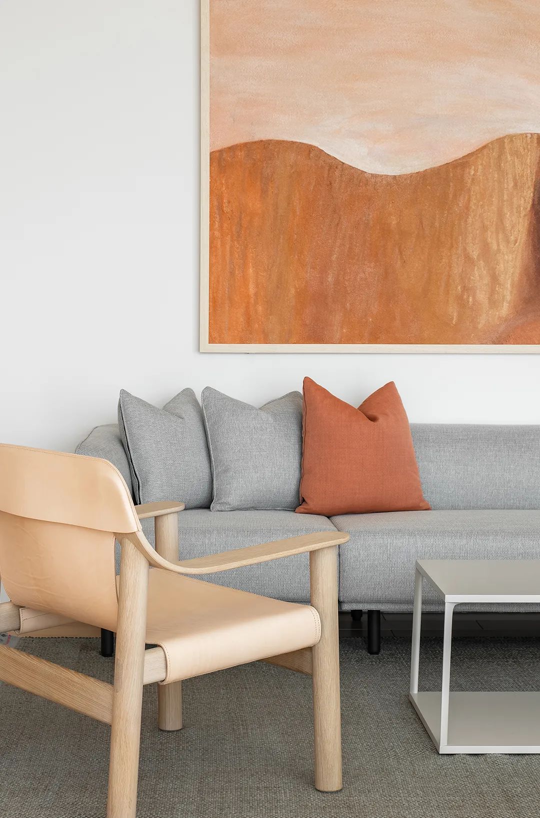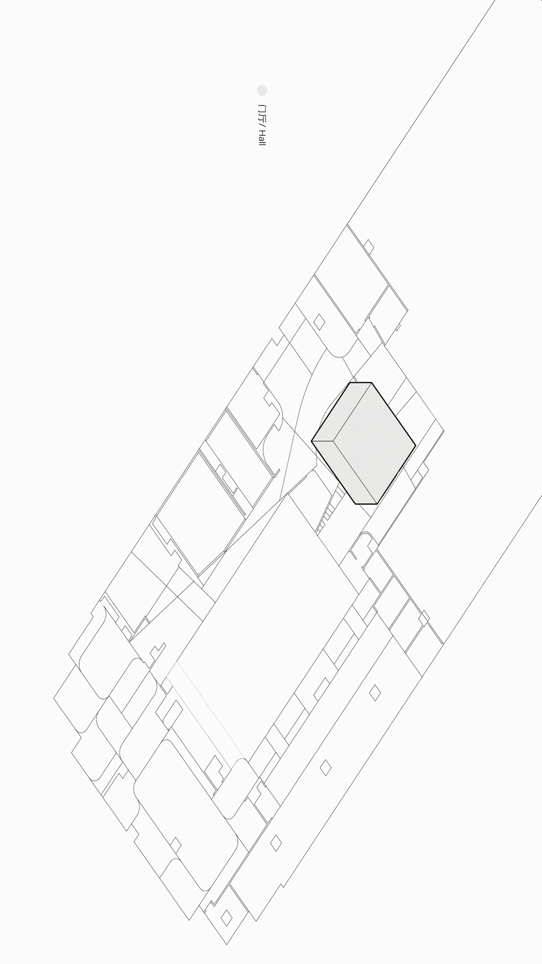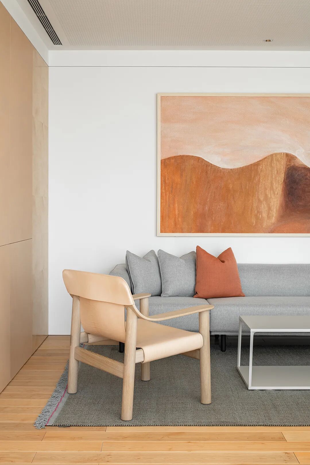 ECCO品牌的标识墙以纯粹的白色与暗光呈现,独立放置于空间一侧。设计师提炼西安斑驳古老的有形文化遗产—城墙,同时辅以ECCO精神内含的“皮革创新”,为接待区打造一面混合不同颜色的皮砖墙,以不同的颜色的皮砖对应皮料制作的不同阶段,同时和西安城墙的历史变迁联系。用波澜起伏的墙面律动感和创新的中西方元素连接吸引访客的目光,墙面内置皮砖样式的礼品盒,可以让客人取出并拿走,以弥补无法带回西安城墙砖的遗憾。材料拼贴的运用以差异的平面色块和质感碰撞融合形成立体的多元空间,突破传统空间整体性色彩带来的单一,呈现颠覆性的感观视效,为人与空间的日常互动增添乐趣。于接待区旁侧预留相对隐秘的休息区,简洁的架构下连通整体又彰显个性。悬挂的皮制艺术品以陕西皮影的皮革为设计灵感,同时融入ECCO皮料辅助完成。小场景的氛围中充盈着现代美学的气息,凸显丹麦文化和西安当地文化的融合。接待区以开放式格局容纳等候区,不同角度和距离之间形成多层次的视觉画面。墙面上悬挂的照片取材自丹麦ECCO工厂旁的麦田,既反映了ECCO的品牌文化,又为空间增添了自然元素,让来访者感受专属ECCO品牌的空间气质。体块穿插之下空间生成许多叠加部分,透过材料拼贴自然带动空间节奏并营造反差场景。