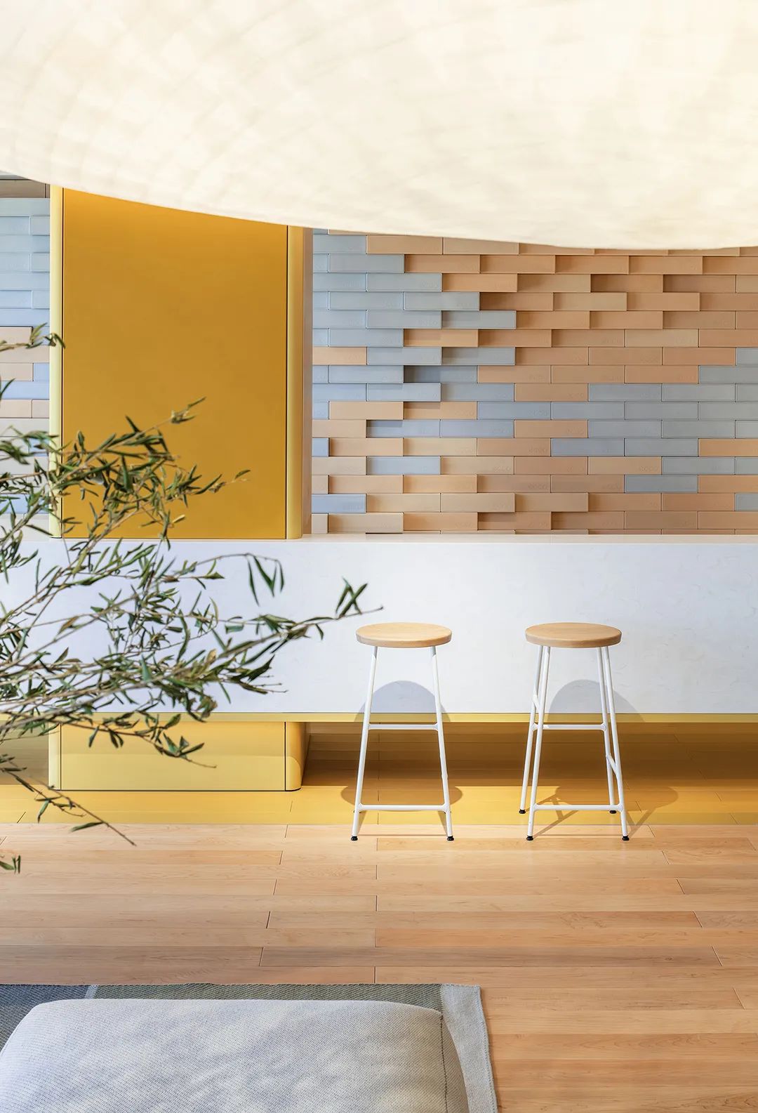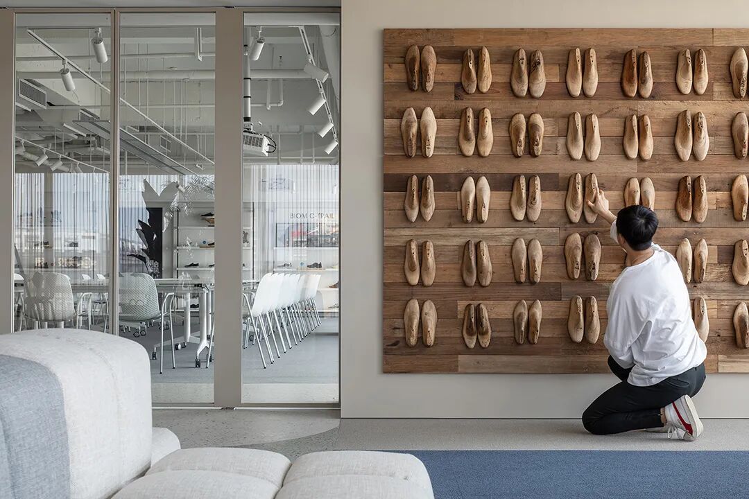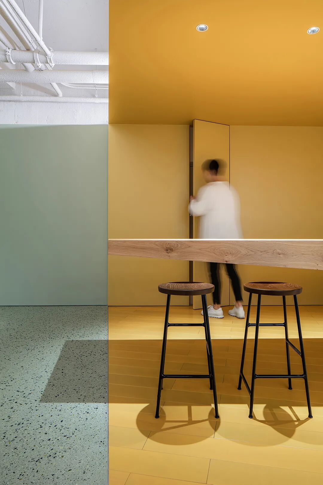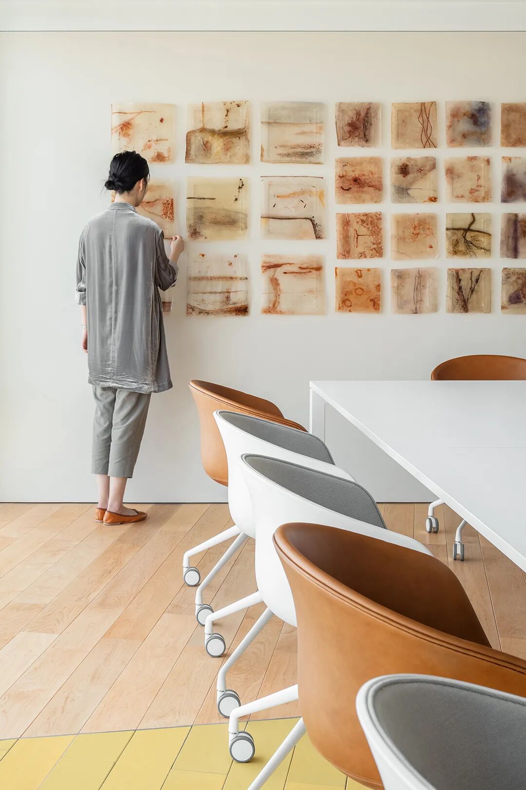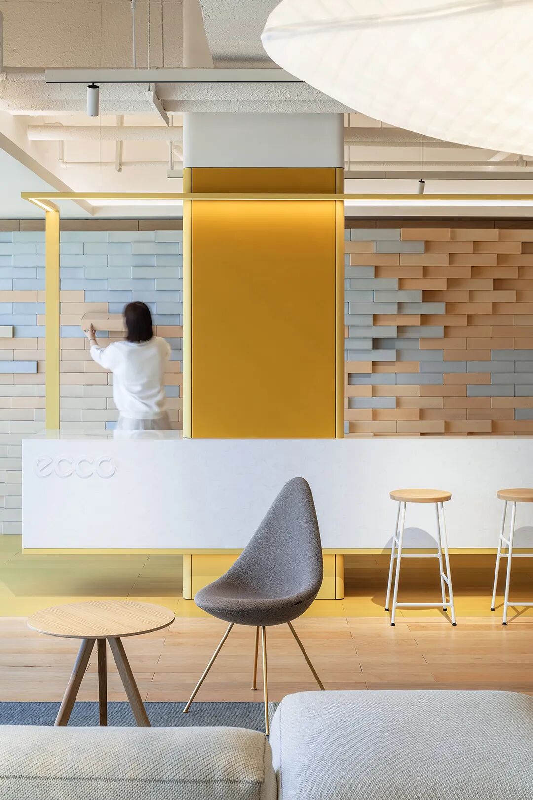移步至会议室区域,墙面装饰的一块块皮影艺术装置由非物质文化遗产传承人亲自打造的。而蚀刻的铝制艺术品展现了品牌内含的自然与环保理念。设计师划分会议室外部空间用于打造茶歇区,以亮黄色凸显功能区域,顶部天花的半封闭设计给予露天歇息的氛围。横向悬空木制桌面内置钢结构,增强稳定性的同时隐藏于墙面之中,用于分隔不同行径路线。顺沿进入贵宾休息区,风格与接待区形成呼应。以传统制鞋用具——楦头为灵感装点背景墙面,专属的艺术作品不仅聚集视线焦点,而且激发来访者想要深入了解制鞋工艺的好奇心。设计师借景展现西安本土文化,在贵宾休息区窗边可以远眺古时用于迎接宾客的永宁门,让客人感受到尊贵的待客之道。创造自由且舒适的开放办公区,多元化的办公和色彩组合为员工创作提供源源不断的活力因子,让人与空间的律动感达到平衡。内部分隔的办公室利用透明的玻璃门与外部形成互动,设计上降低空间的活跃度,以更沉稳的氛围匹配应用场景。自然律动,是ECCO品牌设计的灵感源泉,给予不断创新的动力。灵感不停留于表面,用打破常规的设计创造极度舒适的体验。自然的内涵与品牌的理念被红山设计以创新的手法重新解构,成为ECCO办公空间富有生命力的价值沉淀。