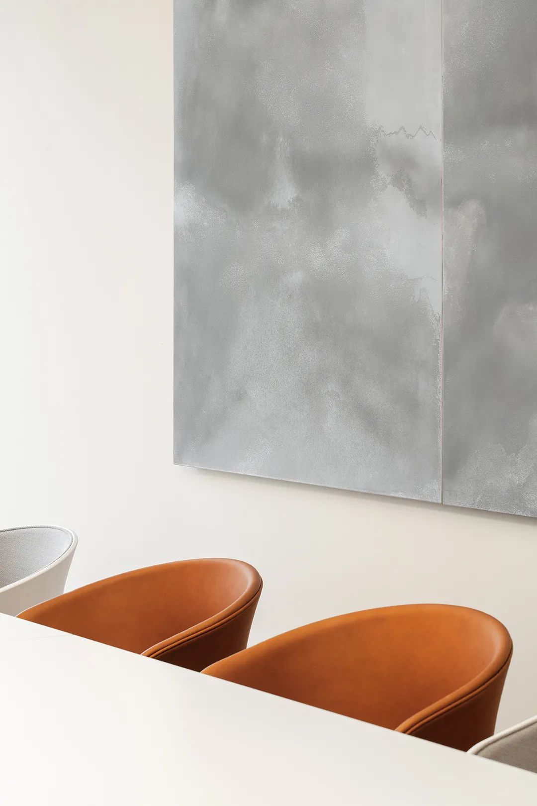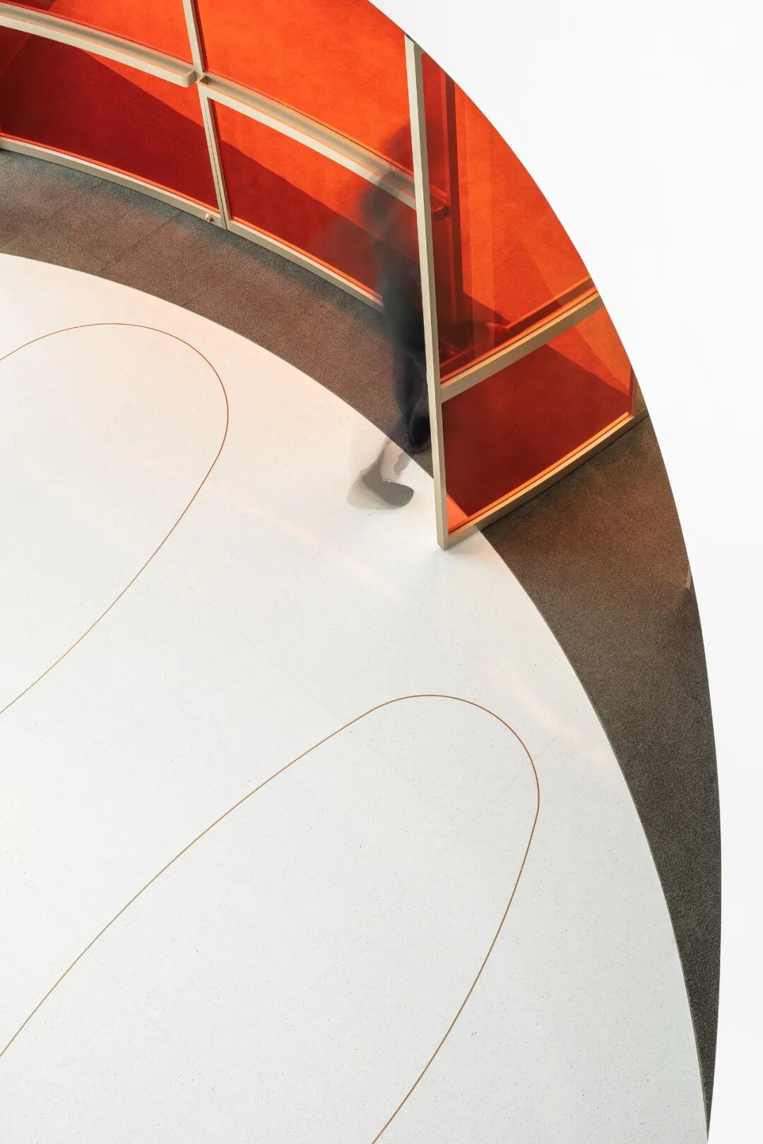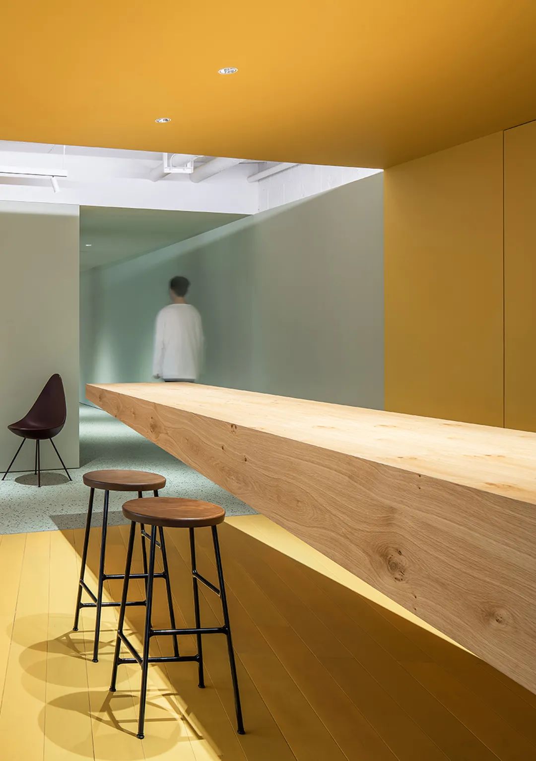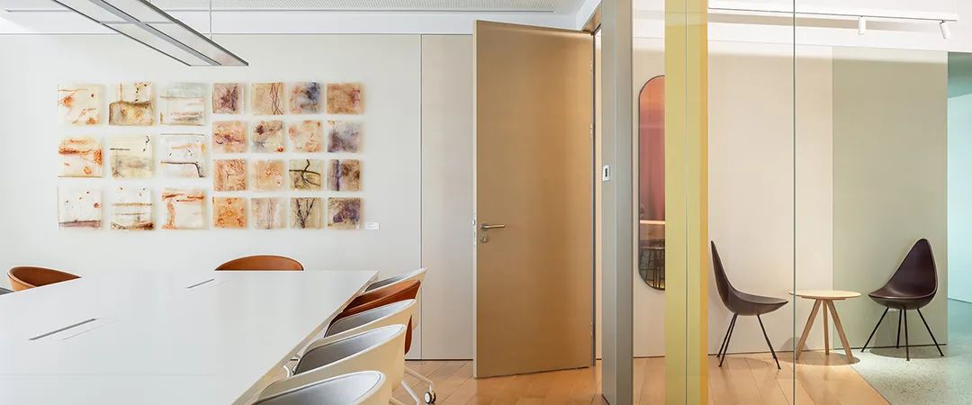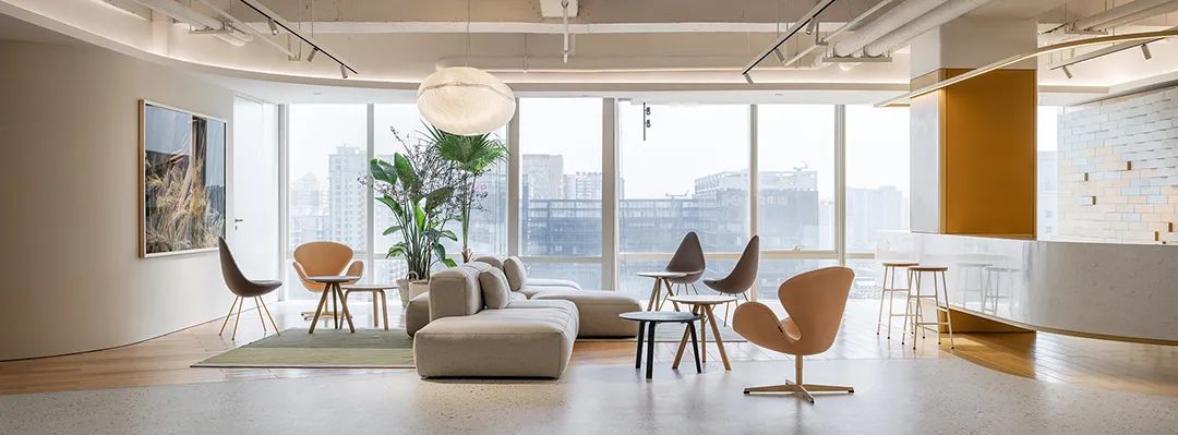 移步至会议室区域,墙面装饰的一块块皮影艺术装置由非物质文化遗产传承人亲自打造的。而蚀刻的铝制艺术品展现了品牌内含的自然与环保理念。设计师划分会议室外部空间用于打造茶歇区,以亮黄色凸显功能区域,顶部天花的半封闭设计给予露天歇息的氛围。横向悬空木制桌面内置钢结构,增强稳定性的同时隐藏于墙面之中,用于分隔不同行径路线。顺沿进入贵宾休息区,风格与接待区形成呼应。以传统制鞋用具——楦头为灵感装点背景墙面,专属的艺术作品不仅聚集视线焦点,而且激发来访者想要深入了解制鞋工艺的好奇心。设计师借景展现西安本土文化,在贵宾休息区窗边可以远眺古时用于迎接宾客的永宁门,让客人感受到尊贵的待客之道。创造自由且舒适的开放办公区,多元化的办公和色彩组合为员工创作提供源源不断的活力因子,让人与空间的律动感达到平衡。内部分隔的办公室利用透明的玻璃门与外部形成互动,设计上降低空间的活跃度,以更沉稳的氛围匹配应用场景。自然律动,是ECCO品牌设计的灵感源泉,给予不断创新的动力。灵感不停留于表面,用打破常规的设计创造极度舒适的体验。自然的内涵与品牌的理念被红山设计以创新的手法重新解构,成为ECCO办公空间富有生命力的价值沉淀。