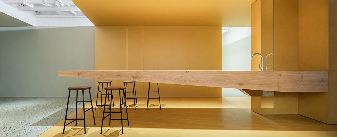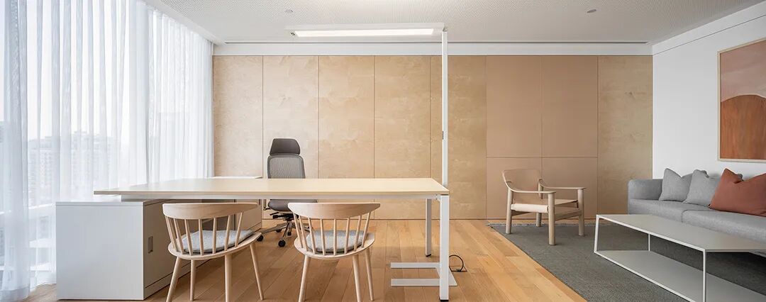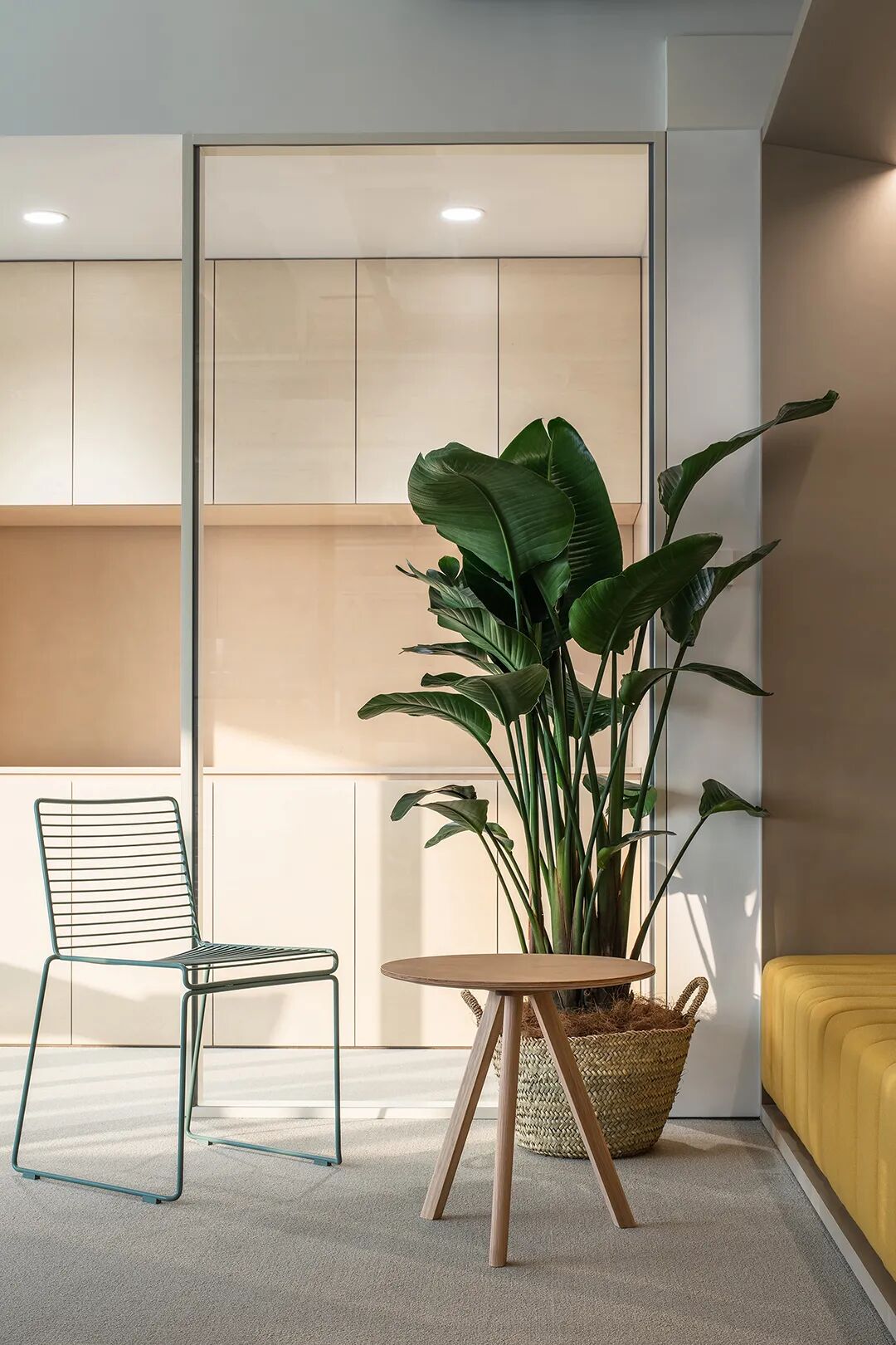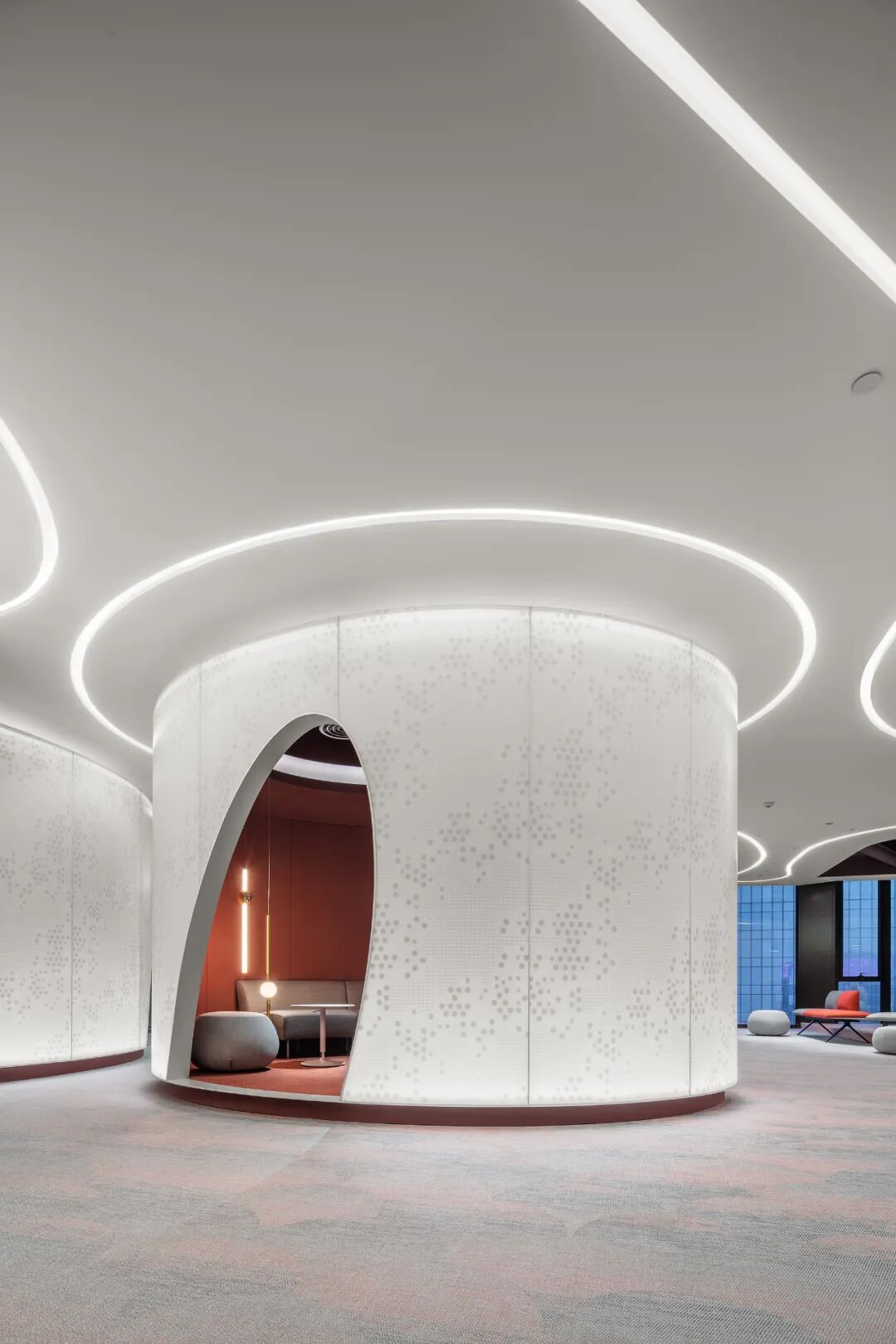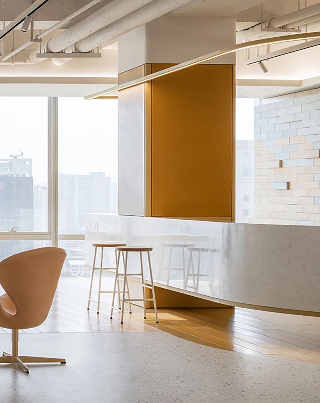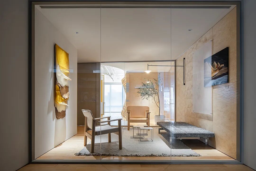 移步至会议室区域,墙面装饰的一块块皮影艺术装置由非物质文化遗产传承人亲自打造的。而蚀刻的铝制艺术品展现了品牌内含的自然与环保理念。设计师划分会议室外部空间用于打造茶歇区,以亮黄色凸显功能区域,顶部天花的半封闭设计给予露天歇息的氛围。横向悬空木制桌面内置钢结构,增强稳定性的同时隐藏于墙面之中,用于分隔不同行径路线。顺沿进入贵宾休息区,风格与接待区形成呼应。以传统制鞋用具——楦头为灵感装点背景墙面,专属的艺术作品不仅聚集视线焦点,而且激发来访者想要深入了解制鞋工艺的好奇心。设计师借景展现西安本土文化,在贵宾休息区窗边可以远眺古时用于迎接宾客的永宁门,让客人感受到尊贵的待客之道。创造自由且舒适的开放办公区,多元化的办公和色彩组合为员工创作提供源源不断的活力因子,让人与空间的律动感达到平衡。内部分隔的办公室利用透明的玻璃门与外部形成互动,设计上降低空间的活跃度,以更沉稳的氛围匹配应用场景。自然律动,是ECCO品牌设计的灵感源泉,给予不断创新的动力。灵感不停留于表面,用打破常规的设计创造极度舒适的体验。自然的内涵与品牌的理念被红山设计以创新的手法重新解构,成为ECCO办公空间富有生命力的价值沉淀。
