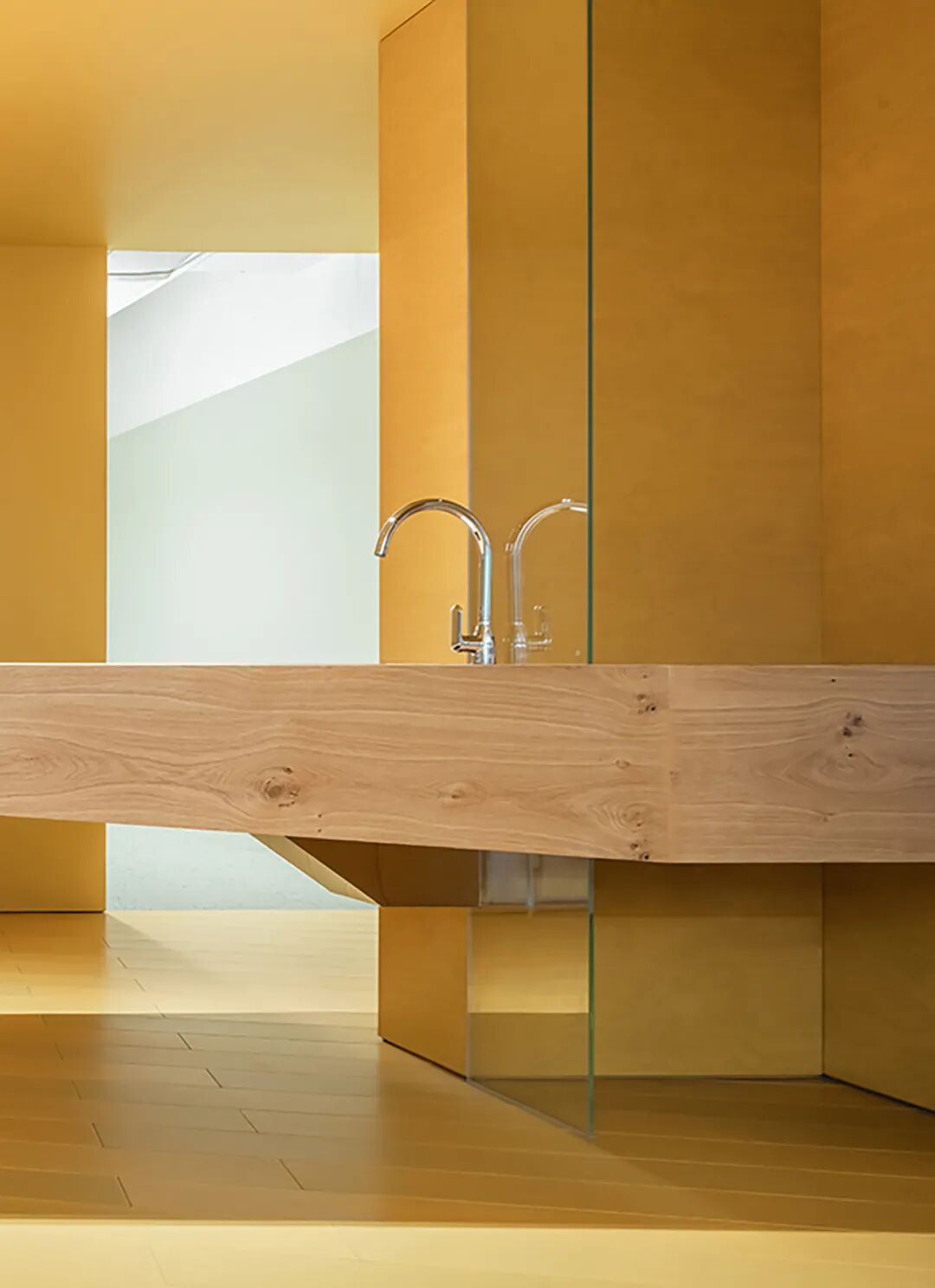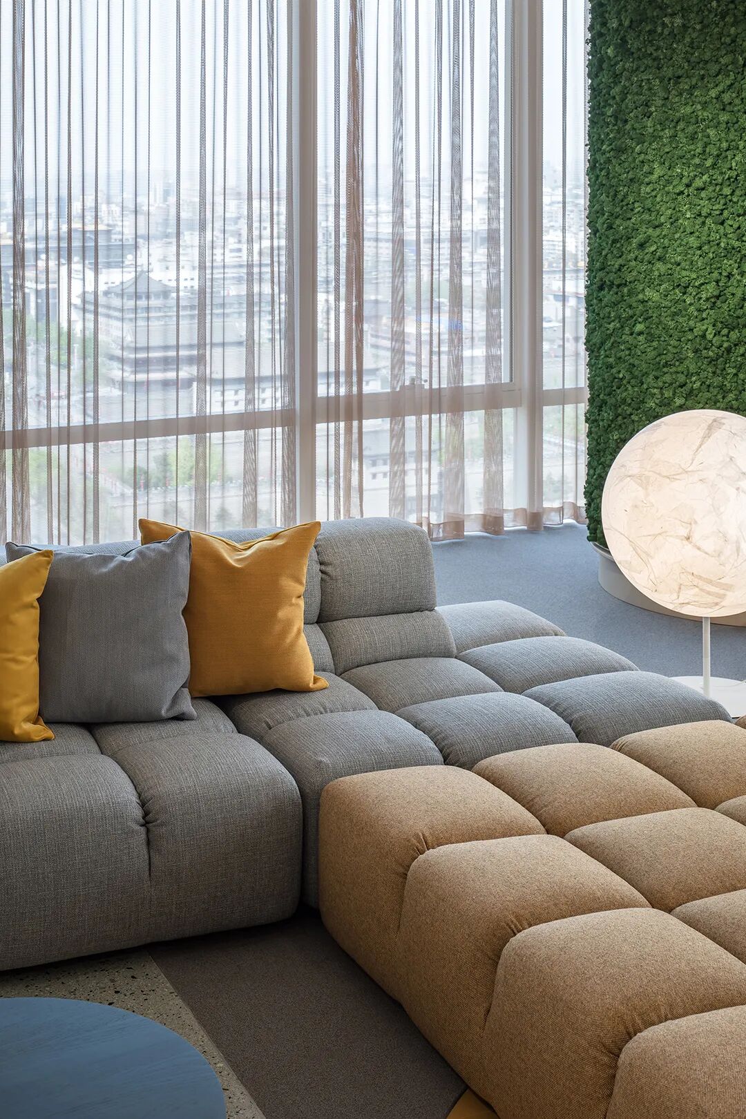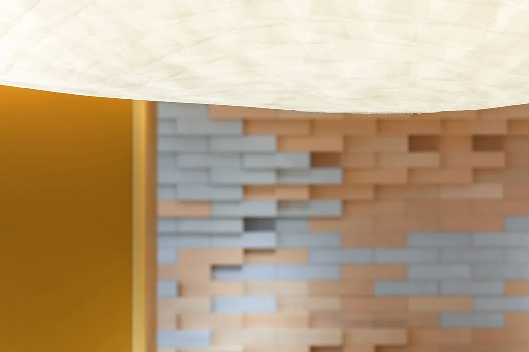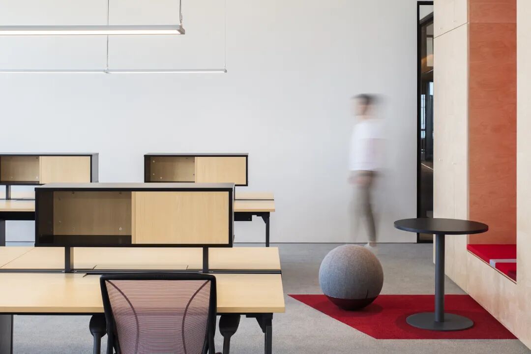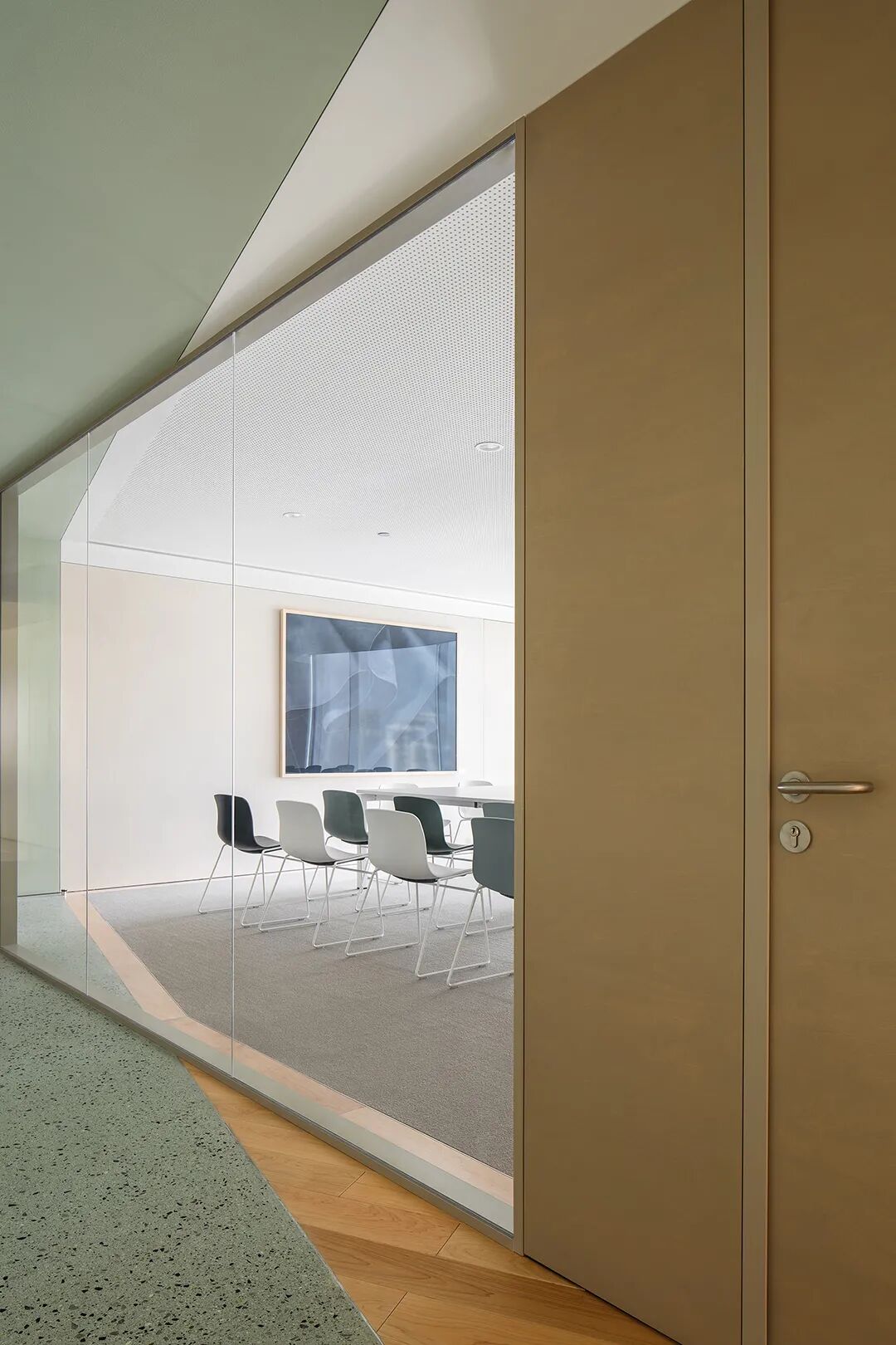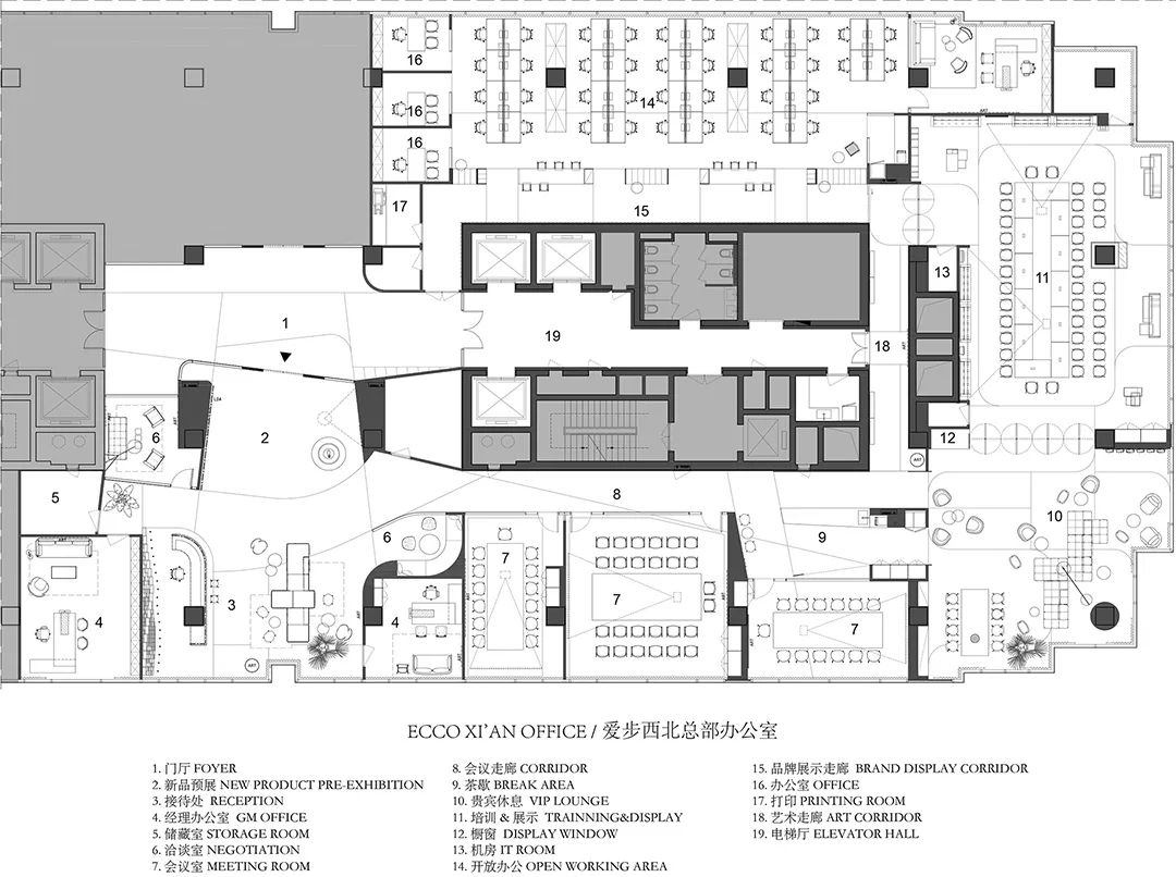 移步至会议室区域,墙面装饰的一块块皮影艺术装置由非物质文化遗产传承人亲自打造的。而蚀刻的铝制艺术品展现了品牌内含的自然与环保理念。设计师划分会议室外部空间用于打造茶歇区,以亮黄色凸显功能区域,顶部天花的半封闭设计给予露天歇息的氛围。横向悬空木制桌面内置钢结构,增强稳定性的同时隐藏于墙面之中,用于分隔不同行径路线。顺沿进入贵宾休息区,风格与接待区形成呼应。以传统制鞋用具——楦头为灵感装点背景墙面,专属的艺术作品不仅聚集视线焦点,而且激发来访者想要深入了解制鞋工艺的好奇心。设计师借景展现西安本土文化,在贵宾休息区窗边可以远眺古时用于迎接宾客的永宁门,让客人感受到尊贵的待客之道。创造自由且舒适的开放办公区,多元化的办公和色彩组合为员工创作提供源源不断的活力因子,让人与空间的律动感达到平衡。内部分隔的办公室利用透明的玻璃门与外部形成互动,设计上降低空间的活跃度,以更沉稳的氛围匹配应用场景。自然律动,是ECCO品牌设计的灵感源泉,给予不断创新的动力。灵感不停留于表面,用打破常规的设计创造极度舒适的体验。自然的内涵与品牌的理念被红山设计以创新的手法重新解构,成为ECCO办公空间富有生命力的价值沉淀。