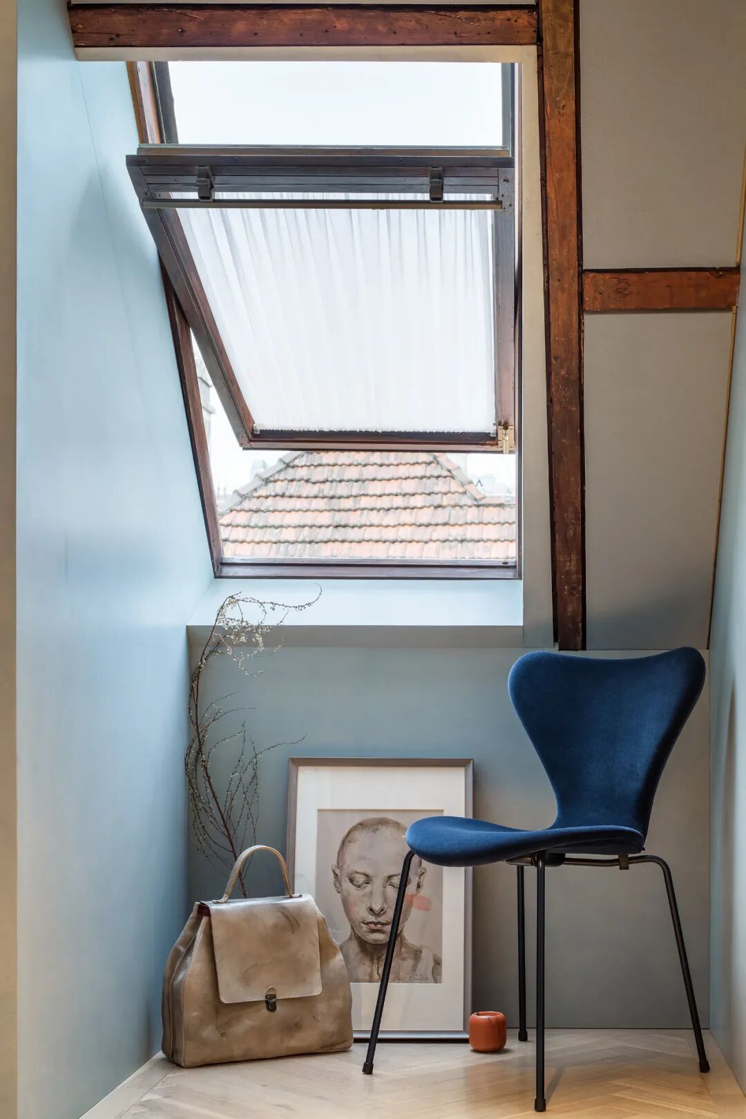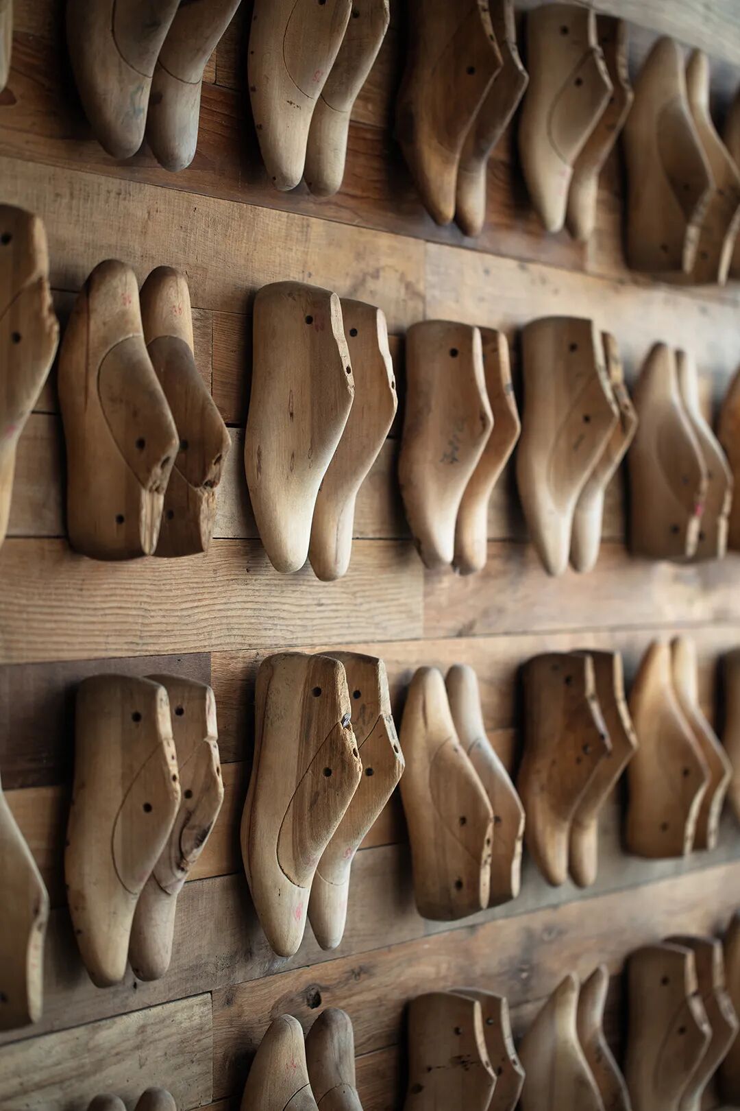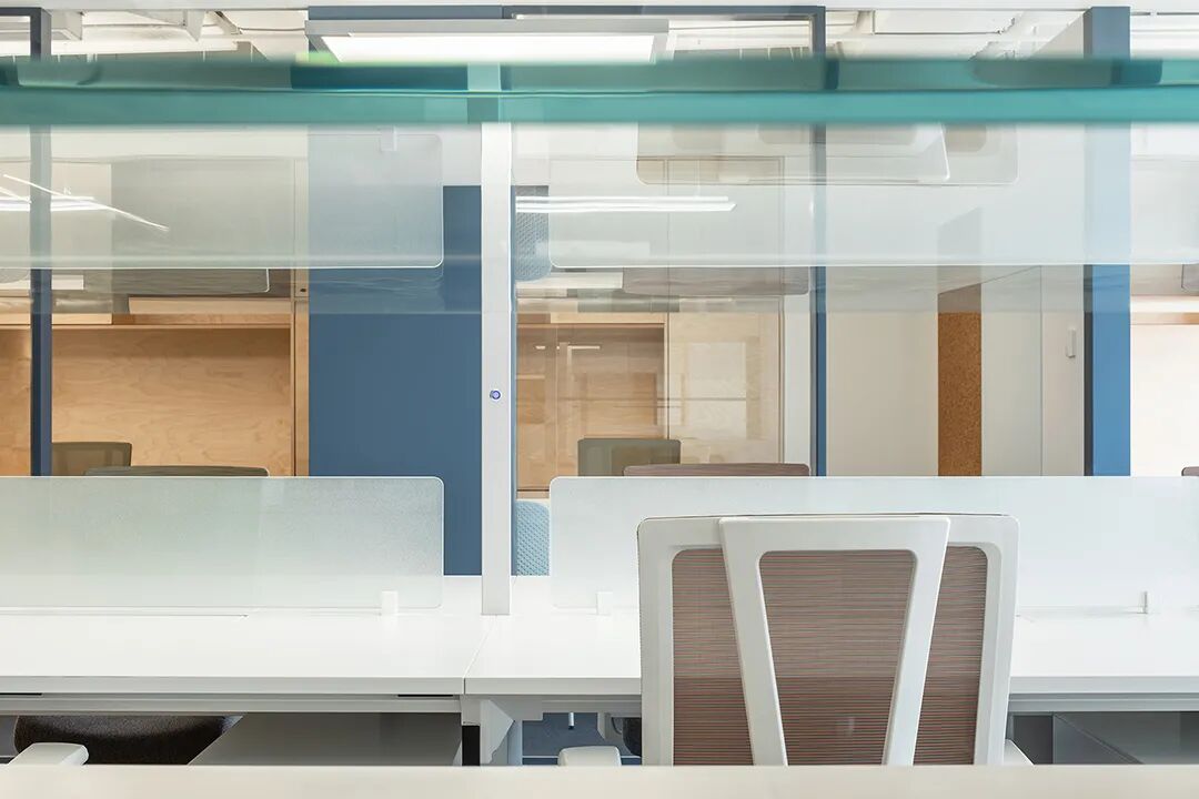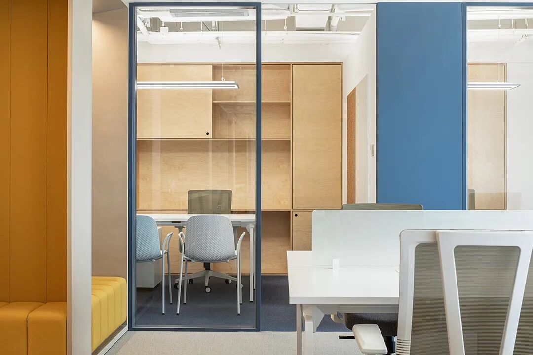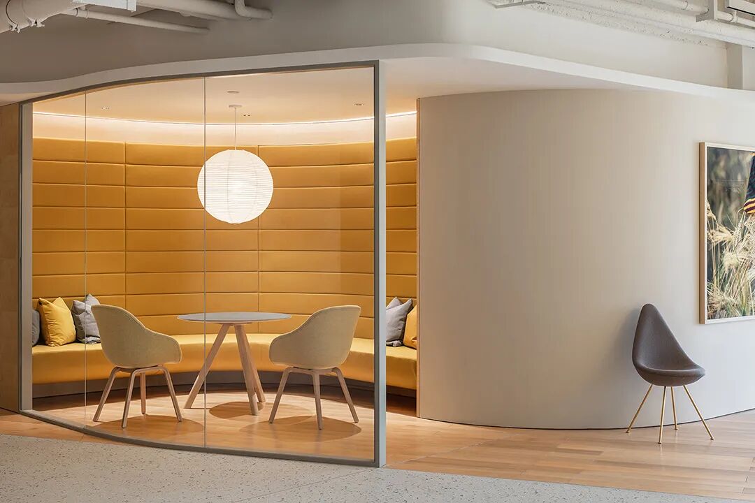 移步至会议室区域,墙面装饰的一块块皮影艺术装置由非物质文化遗产传承人亲自打造的。而蚀刻的铝制艺术品展现了品牌内含的自然与环保理念。设计师划分会议室外部空间用于打造茶歇区,以亮黄色凸显功能区域,顶部天花的半封闭设计给予露天歇息的氛围。横向悬空木制桌面内置钢结构,增强稳定性的同时隐藏于墙面之中,用于分隔不同行径路线。顺沿进入贵宾休息区,风格与接待区形成呼应。以传统制鞋用具——楦头为灵感装点背景墙面,专属的艺术作品不仅聚集视线焦点,而且激发来访者想要深入了解制鞋工艺的好奇心。设计师借景展现西安本土文化,在贵宾休息区窗边可以远眺古时用于迎接宾客的永宁门,让客人感受到尊贵的待客之道。创造自由且舒适的开放办公区,多元化的办公和色彩组合为员工创作提供源源不断的活力因子,让人与空间的律动感达到平衡。内部分隔的办公室利用透明的玻璃门与外部形成互动,设计上降低空间的活跃度,以更沉稳的氛围匹配应用场景。自然律动,是ECCO品牌设计的灵感源泉,给予不断创新的动力。灵感不停留于表面,用打破常规的设计创造极度舒适的体验。自然的内涵与品牌的理念被红山设计以创新的手法重新解构,成为ECCO办公空间富有生命力的价值沉淀。